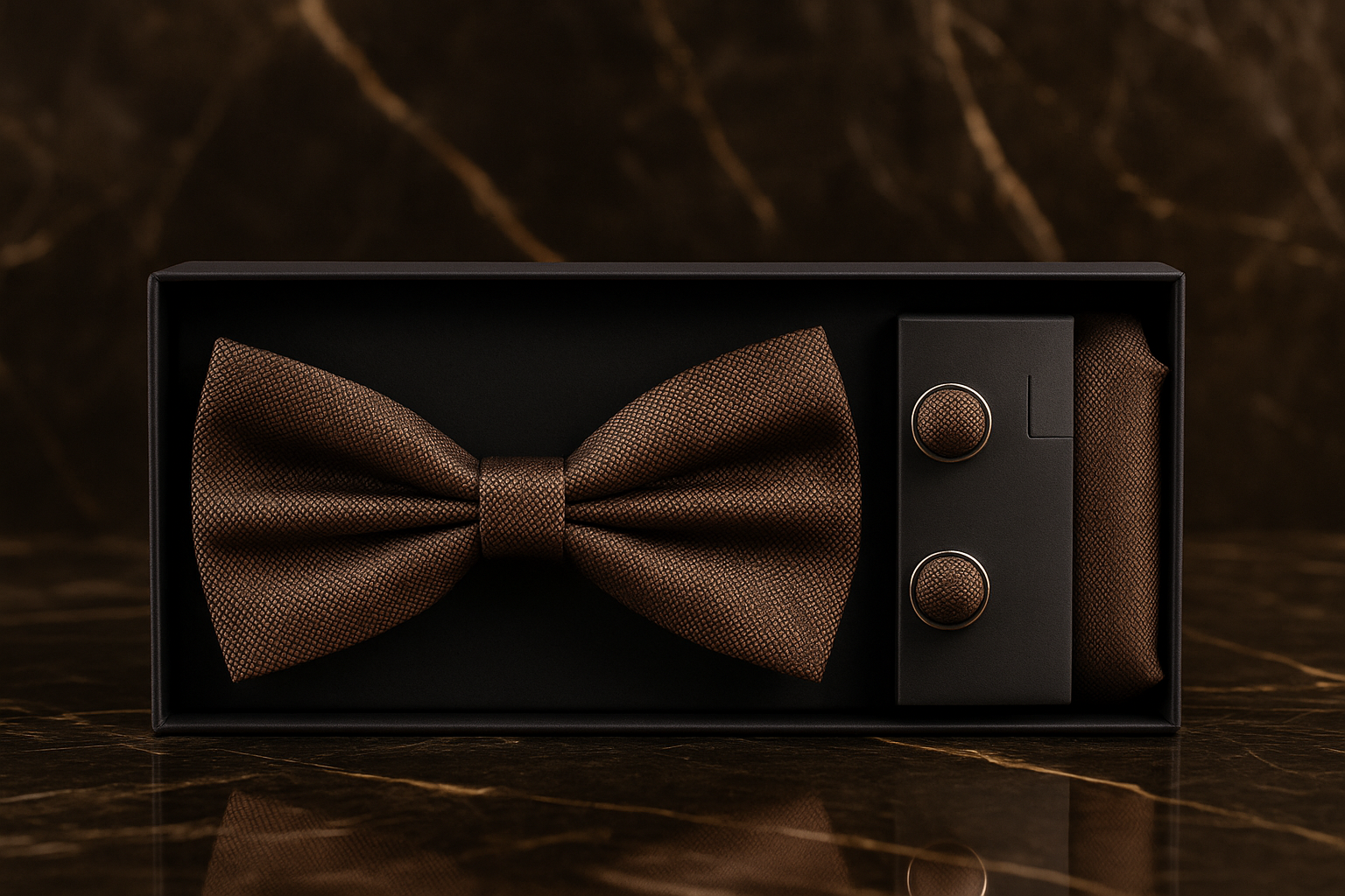 Set bărbătesc rafinat, construit în jurul unei nuanțe calde de maro bronzat, cu textură fină și aspect sofisticat. Papionul oferă un echilibru perfect între clasic și modern, batis­ta completează elegant ansamblul, iar butonii adaugă un accent discret de stil. Este un set dedicat bărbatului care preferă eleganța matură, sigură, fără ostentație.