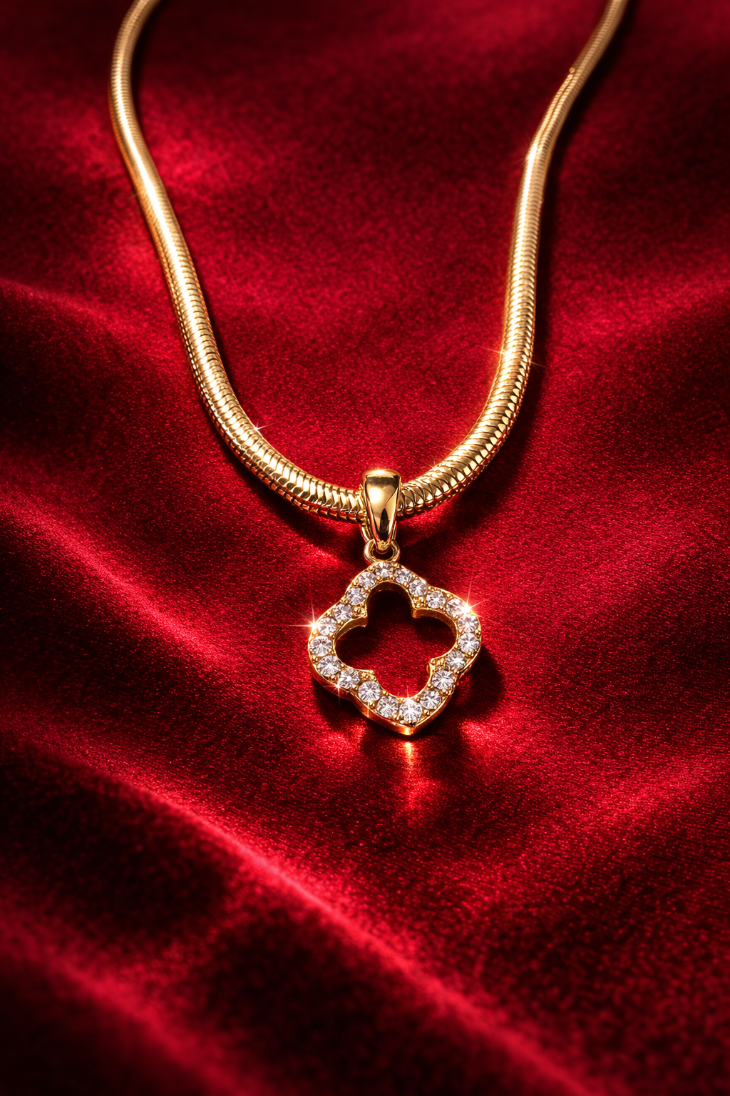 Colier rafinat cu lanț tip snake, fluid și fin, completat de un pandantiv trifoi stilizat cu contur decorat cu micro-cristale strălucitoare. Designul minimalist pune accent pe eleganță și echilibru, oferind un look sofisticat, dar ușor de purtat zilnic.