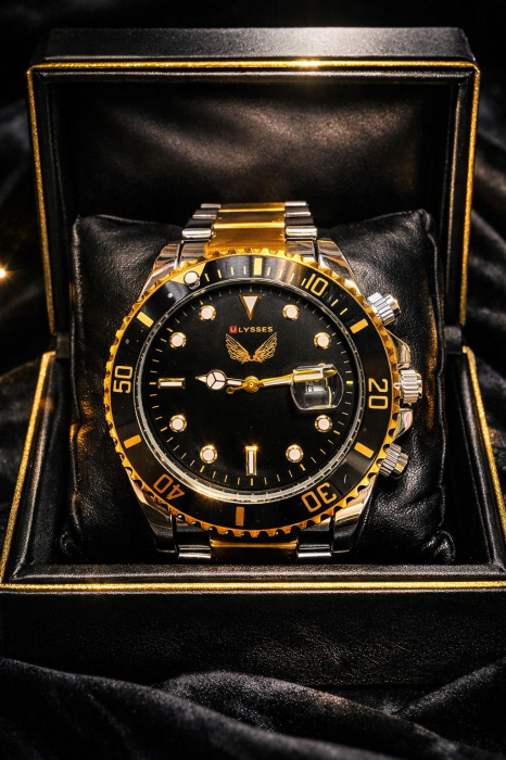 Ceas bărbătesc cu design impunător, finisaje black & gold și detalii atent lucrate pentru un look sofisticat și puternic. Cadranul negru intens este evidențiat de marcaje aurii și bezel rotativ cu accente contrastante, oferind un aer premium și masculin.