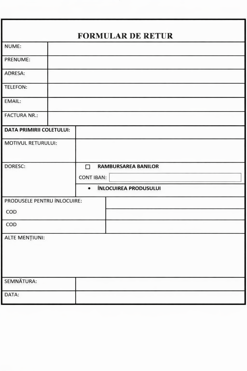 Formularul de retur il gasiti la acest link https://www.andrarose.ro/formular-retur-produse si se va trimite automat catre noi. Pentru a procesa un retur, dati click aici.