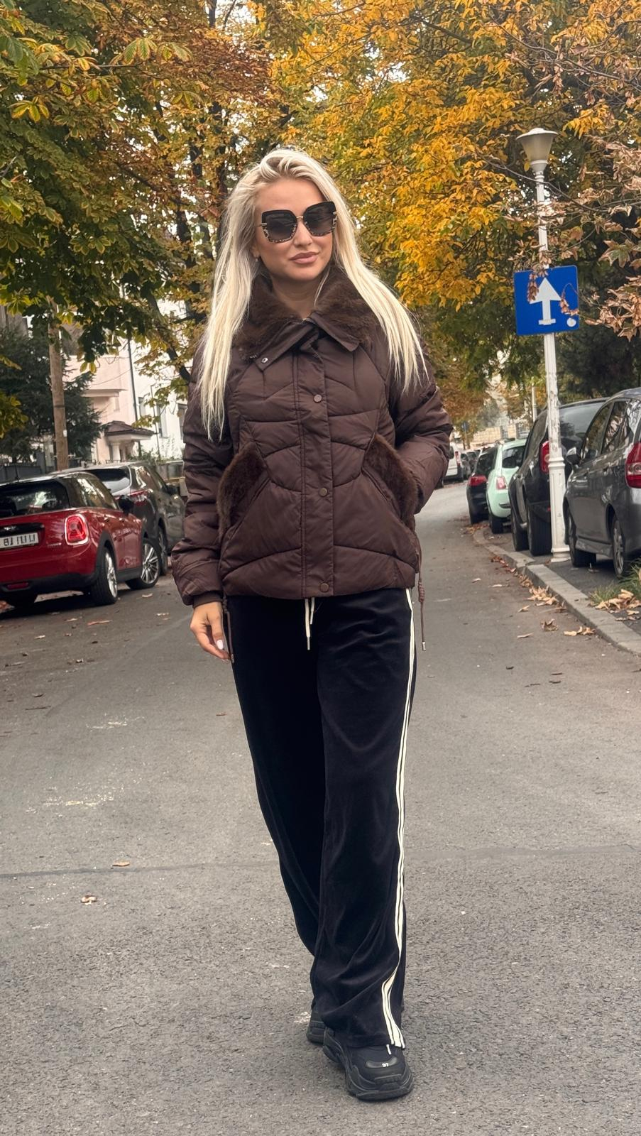 Designul este completat de buzunare laterale îmblănite și șnururi ajustabile la tiv, pentru o siluetă modernă și bine conturată.