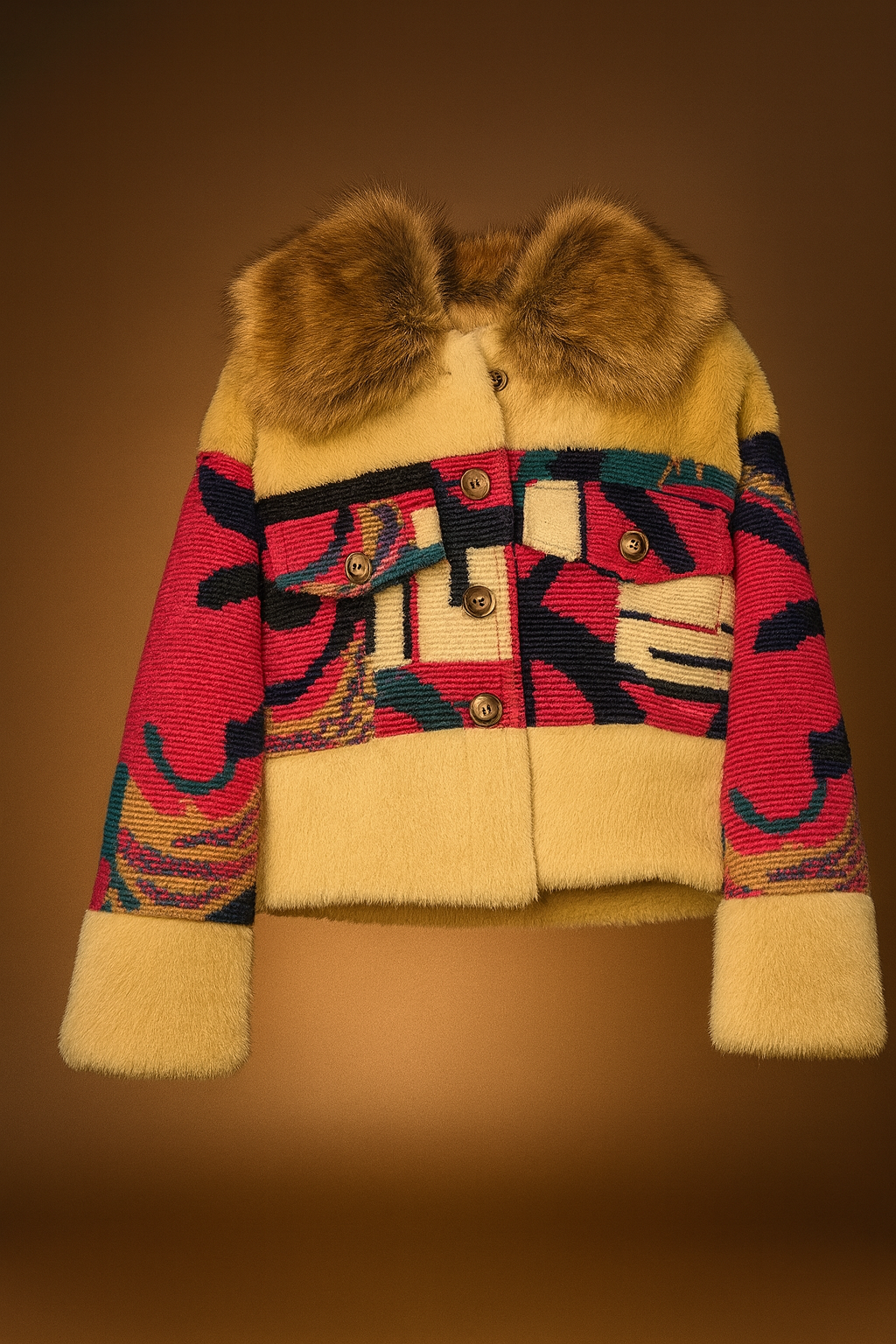 💫 Palton scurt din lână naturală cu inserții de mohair și guler din blană ecologică ivory.
