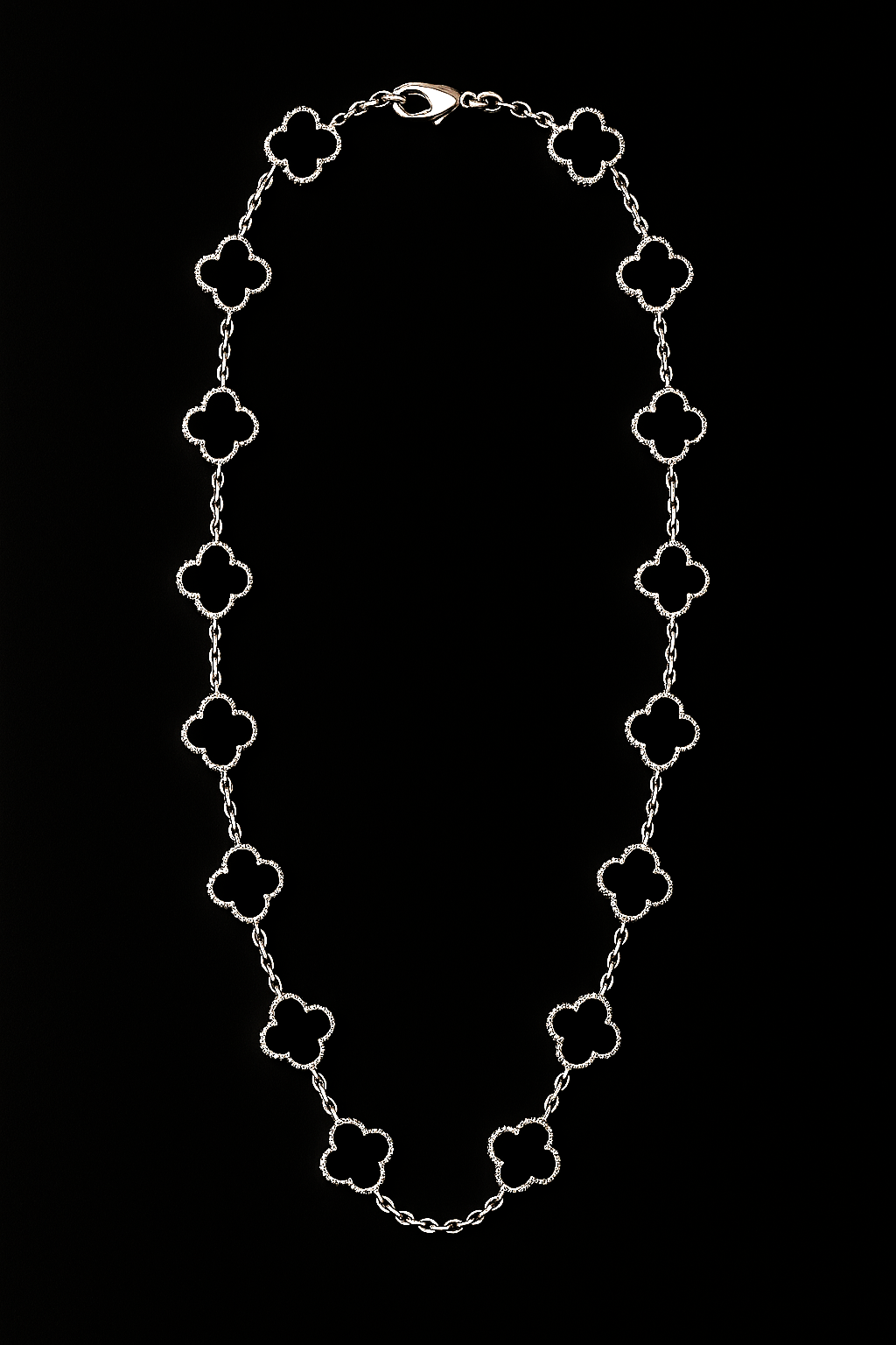Black Onyx  Clover  este o piesă cu impact vizual instant, construită pentru cliente care vor un look luxury, precis și modern. Motivele trifoi cu inserții negre tip onix creează un contrast puternic cu lanțul argintiu, rezultând o piesă elegantă, grafică și extrem de versatilă. Fiecare element este finisat cu margini texturate fine, care reflectă lumina subtil și dau colierului acel aspect high-end de bijuterie de brand.