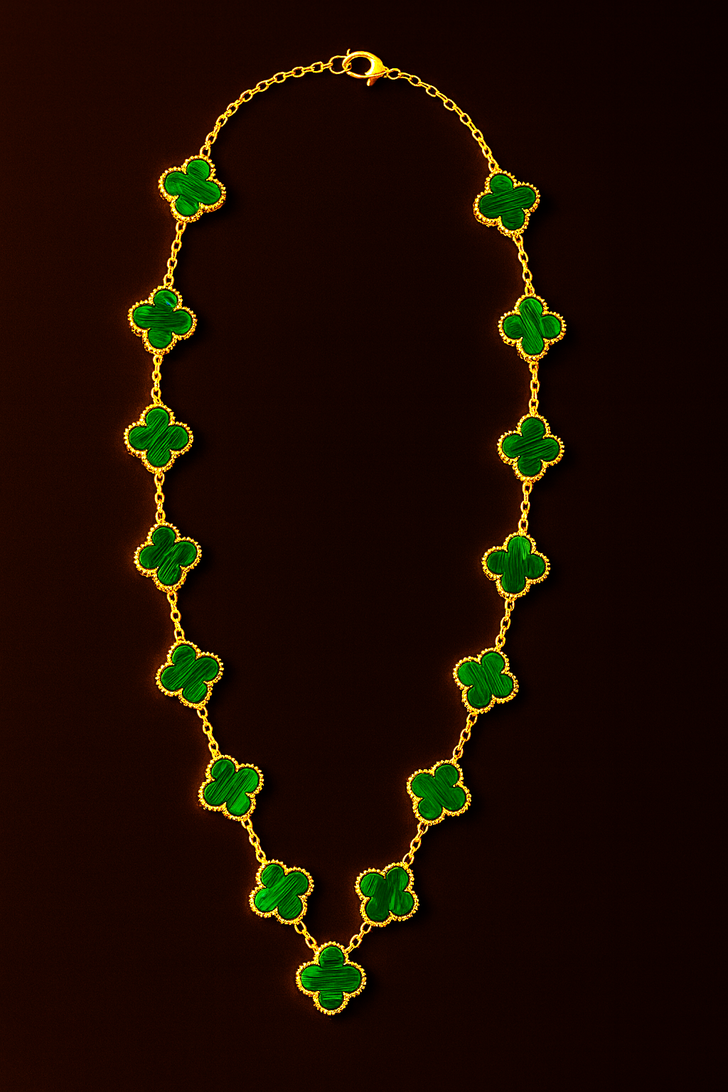 Emerald Clover Gold Line este o piesă statement cu ADN premium, construită pentru vizibilitate maximă. Pandantivele în formă de trifoi, finisate în verde intens tip malachit, sunt montate pe un lanț subțire placat cu aur, creând un contrast puternic și extrem de elegant. Textura fină a marginilor aurii oferă acel look high-end specific bijuteriilor de brand.