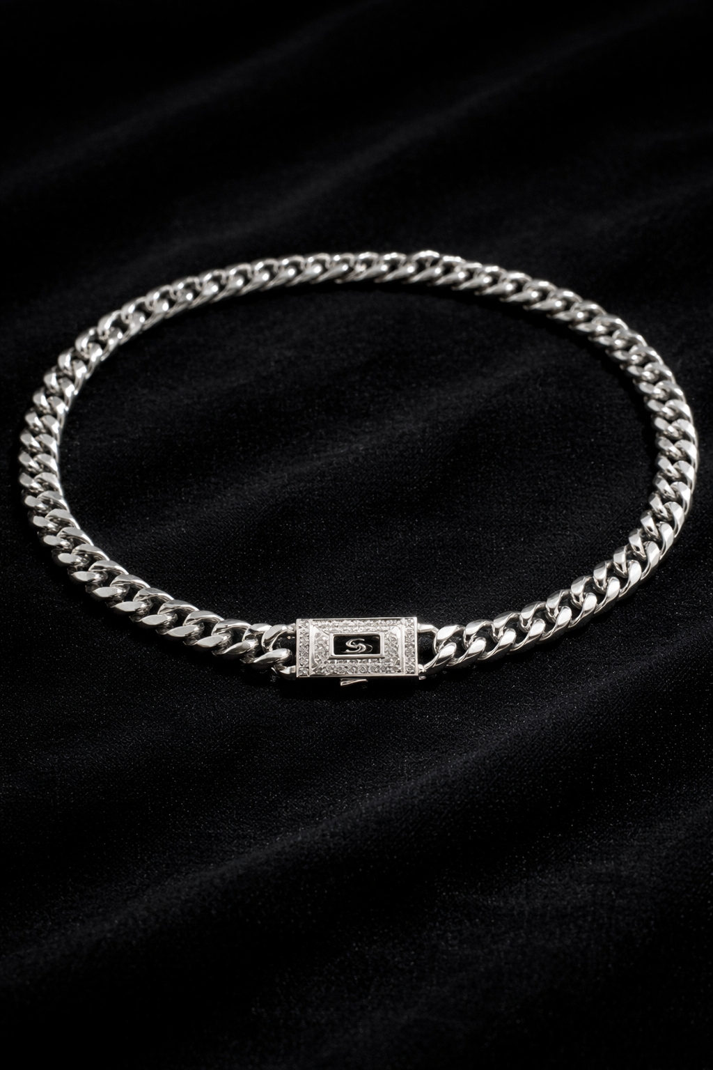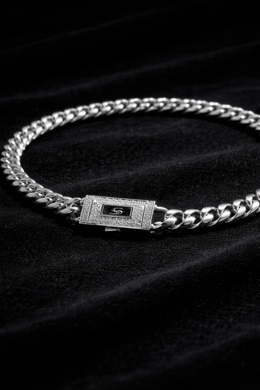 Colier statement tip Cuban link, cu zale compacte și finisaj argintiu lucios, creat pentru un look puternic și modern. Designul este completat de o închizătoare rectangulară decorată cu micro-cristale, care adaugă un accent premium și un plus de rafinament.