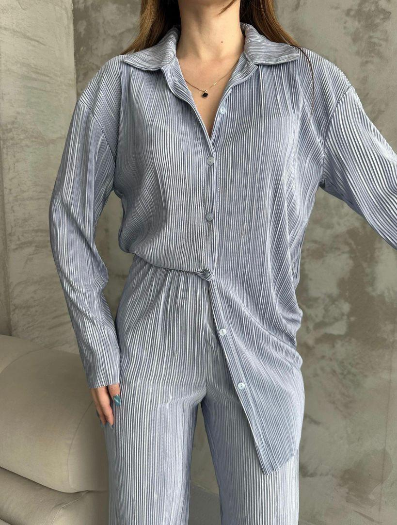 Compleu plisat compus din camasa lunga cu rever, inchidere cu nasturi in fata si decupaj lateral si pantalon drept cu banda elastica in zona taliei.