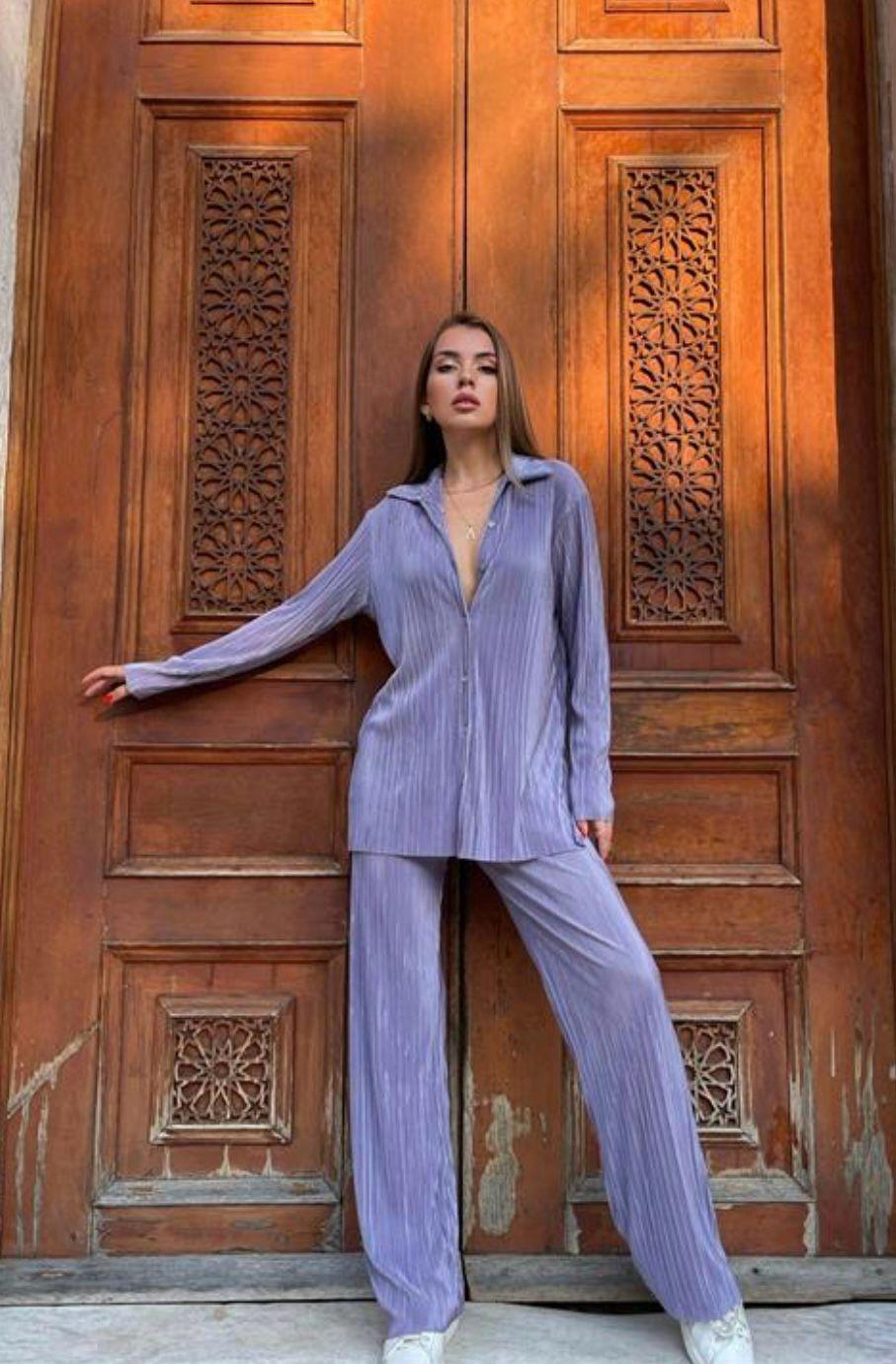 Compleu plisat compus din camasa lunga cu rever, inchidere cu nasturi in fata si decupaj lateral si pantalon drept cu banda elastica in zona taliei.