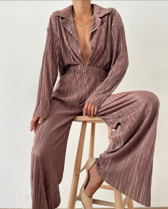 Compleu plisat compus din camasa lunga cu rever, inchidere cu nasturi in fata si decupaj lateral si pantalon drept cu banda elastica in zona taliei.