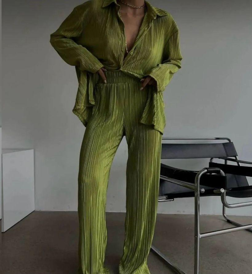 Compleu plisat compus din camasa lunga cu rever, inchidere cu nasturi in fata si decupaj lateral si pantalon drept cu banda elastica in zona taliei.