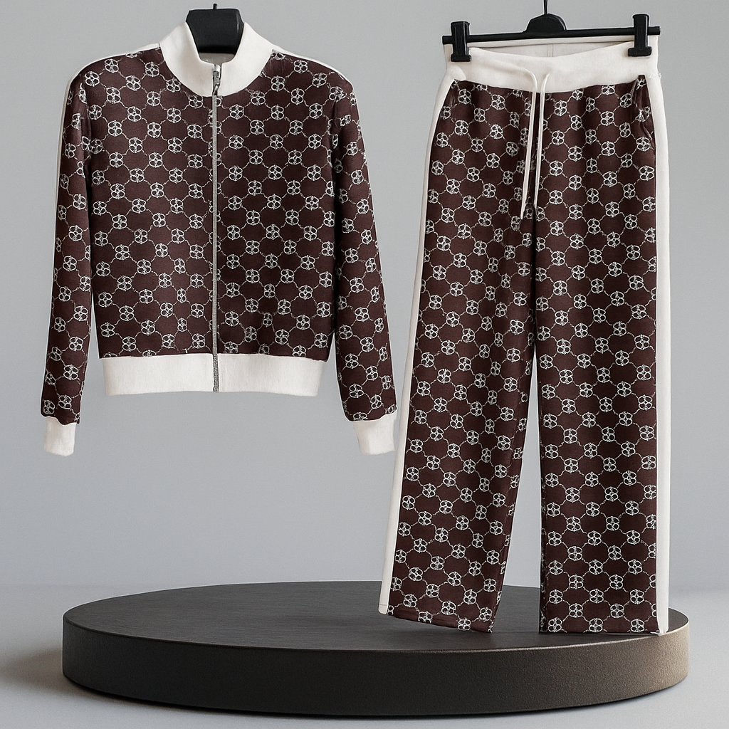 Compleul „Monogram Elegance Premium” redefinește stilul sport-couture printr-o îmbinare perfectă între confort, rafinament și atenție la detalii. Realizat dintr-un material de calitate superioară — un amestec fin de bumbac moale, elastan și fibră tehnică pentru rezistență și elasticitate — acest set oferă o purtare lejeră, dar impecabilă din punct de vedere estetic.