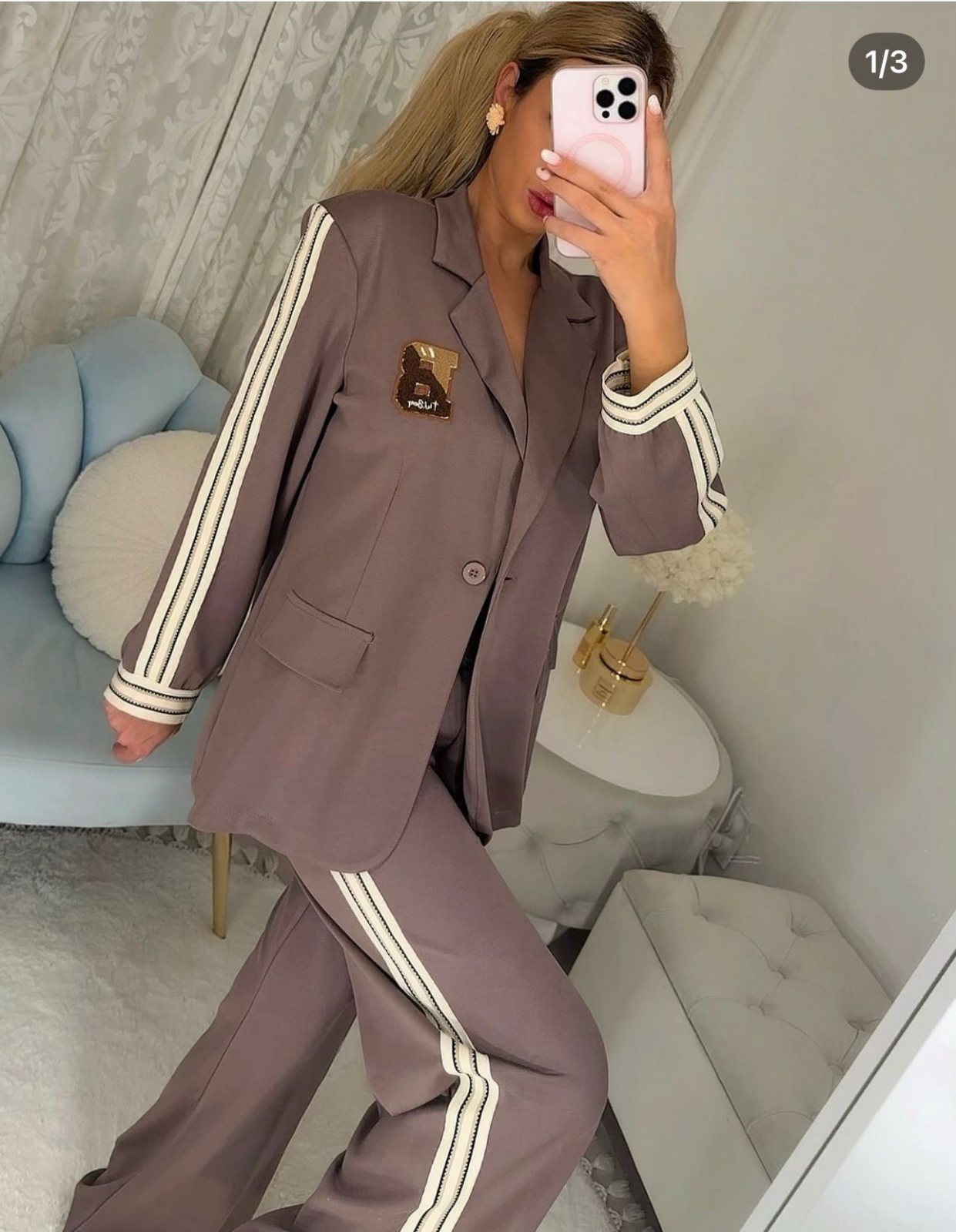 💫 Costum premium în stil smart casual, format din sacou cu dungi contrastante și pantaloni cu talie elastică.