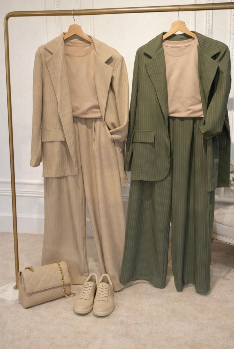 Costum modern din două piese – sacou structurat și pantaloni cu croială dreaptă, realizat într-un design cu dungi fine verticale pentru efect optic de alungire a siluetei. Sacoul are croi lejer, cu rever clasic și buzunare aplicate, iar pantalonii oferă confort și mobilitate prin linia fluidă.