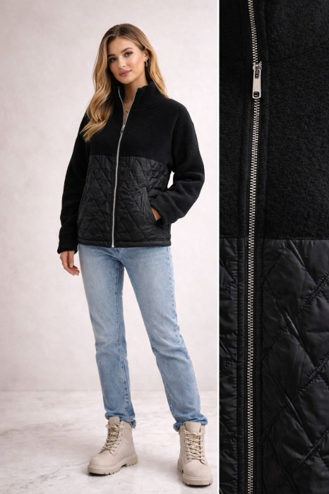 Geacă modernă, cu design contrastant și structură mixtă, ideală pentru sezonul rece sau zilele de tranziție. Partea superioară este realizată din material tip fleece, moale și confortabil, care oferă căldură și un aspect minimalist. Partea inferioară este matlasată, cu inserții ușor lucioase, pentru un plus de protecție termică și un aer urban.