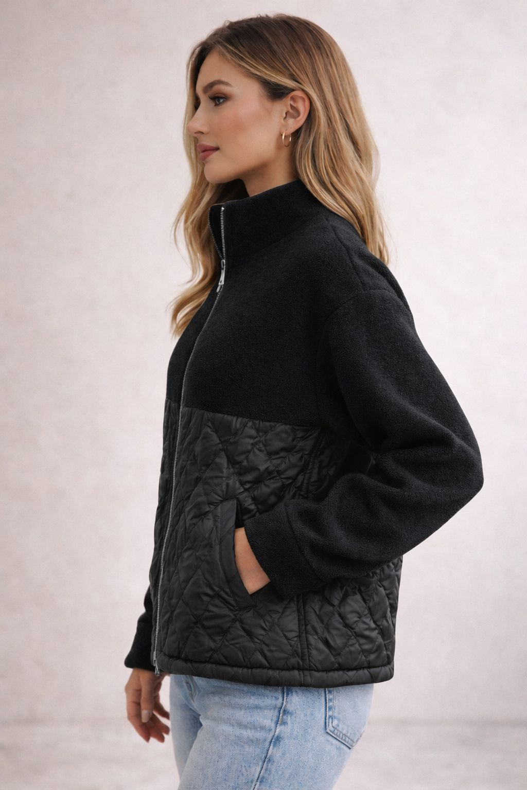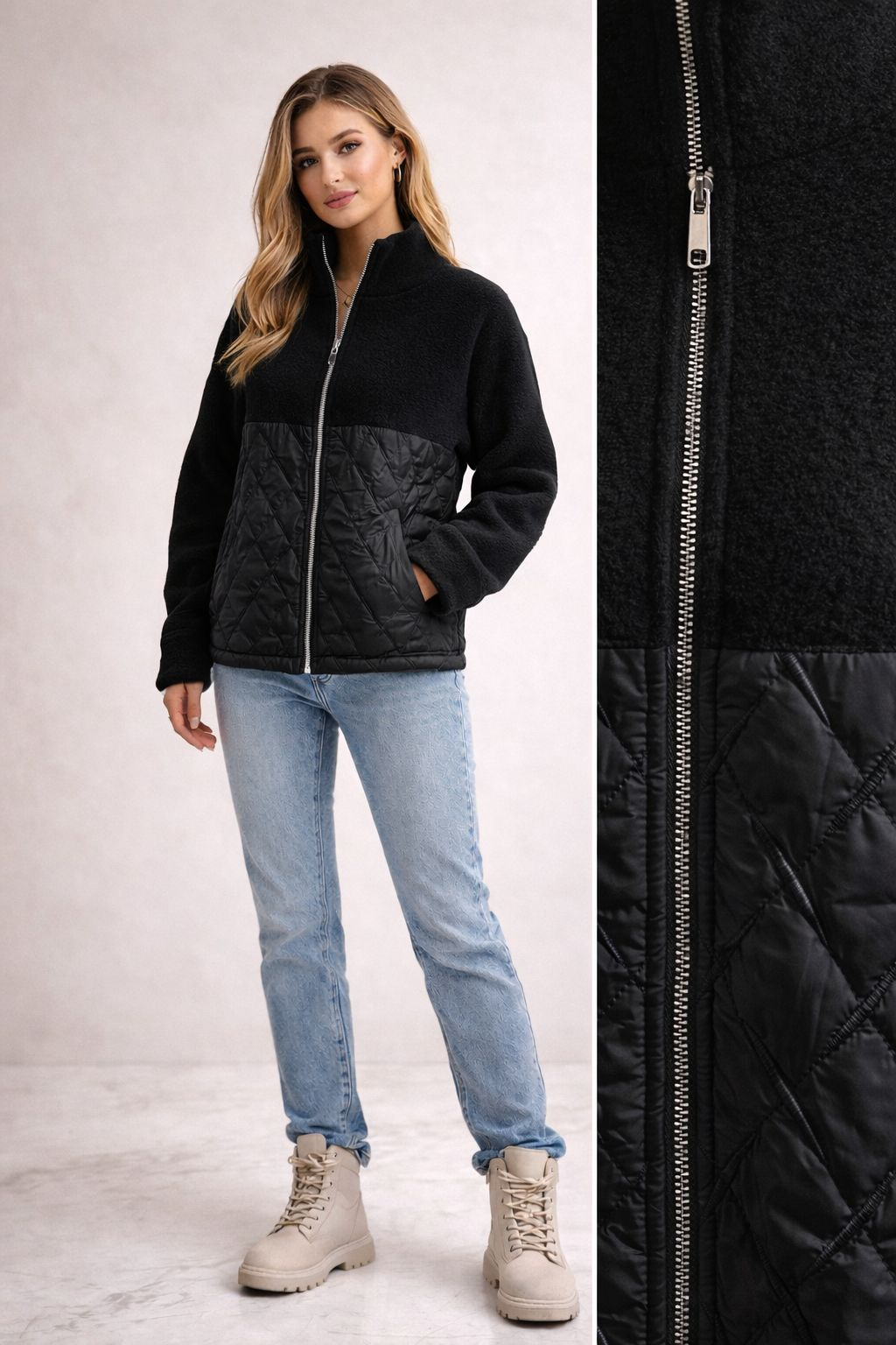 Croiala lejeră, gulerul înalt și închiderea frontală cu fermoar metalic transformă această piesă într-o alegere practică și stilată. Buzunarele laterale sunt funcționale, iar combinația de texturi adaugă profunzime vizuală și versatilitate în styling.