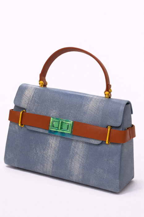 Model structurat, cu siluetă clasică reinterpretată modern prin combinația cromatică contrastantă. Corpul genții într-o nuanță albastru denim texturat este pus în valoare de bareta și mânerul în ton coniac, creând un echilibru vizual puternic și actual.