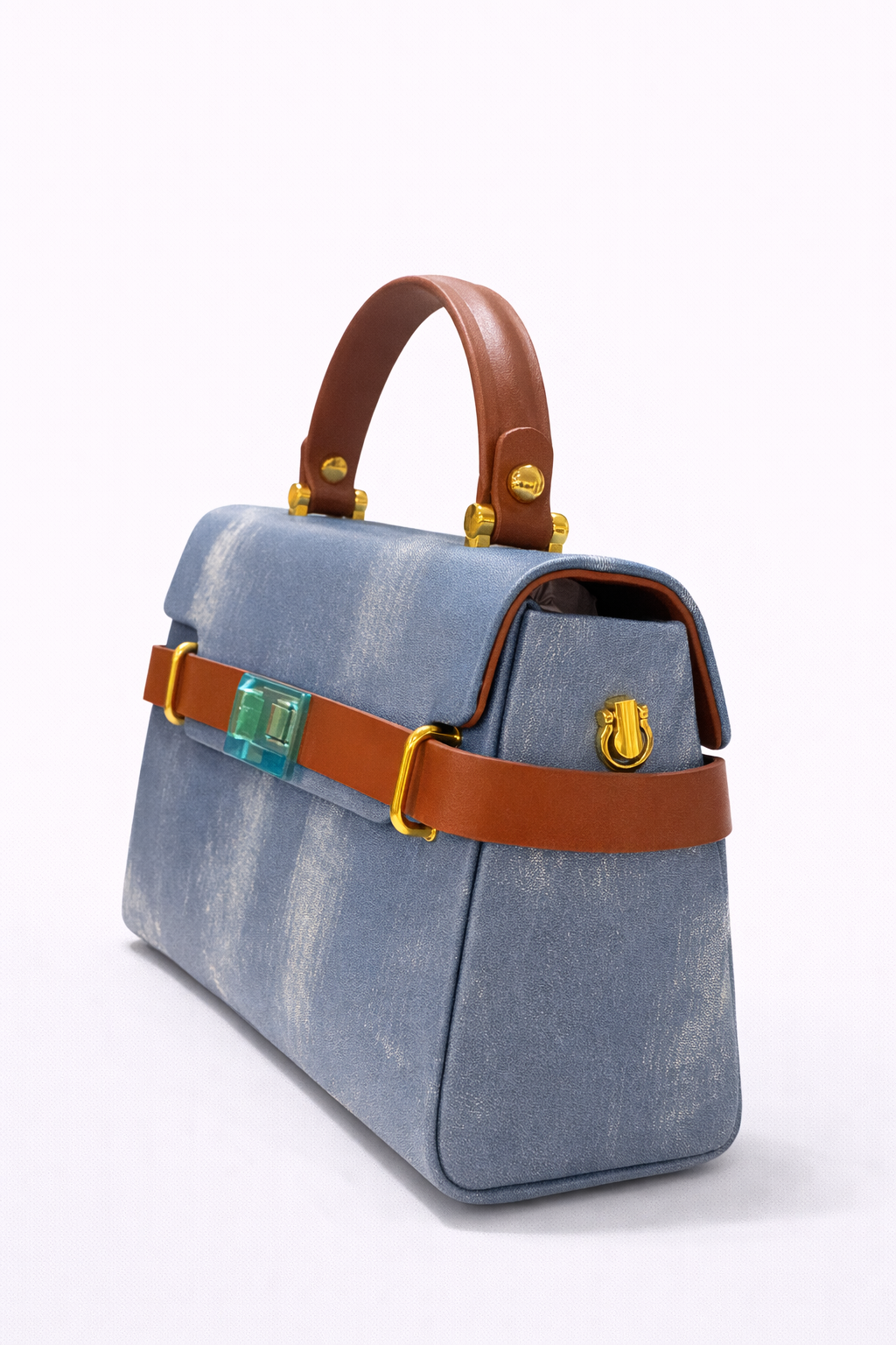 Elementul central – închiderea frontală tip lock cu detaliu verde translucid – adaugă personalitate și diferențiere clară în piață. Accesoriile metalice aurii consolidează poziționarea premium, iar forma rigidă oferă stabilitate și organizare eficientă a interiorului.