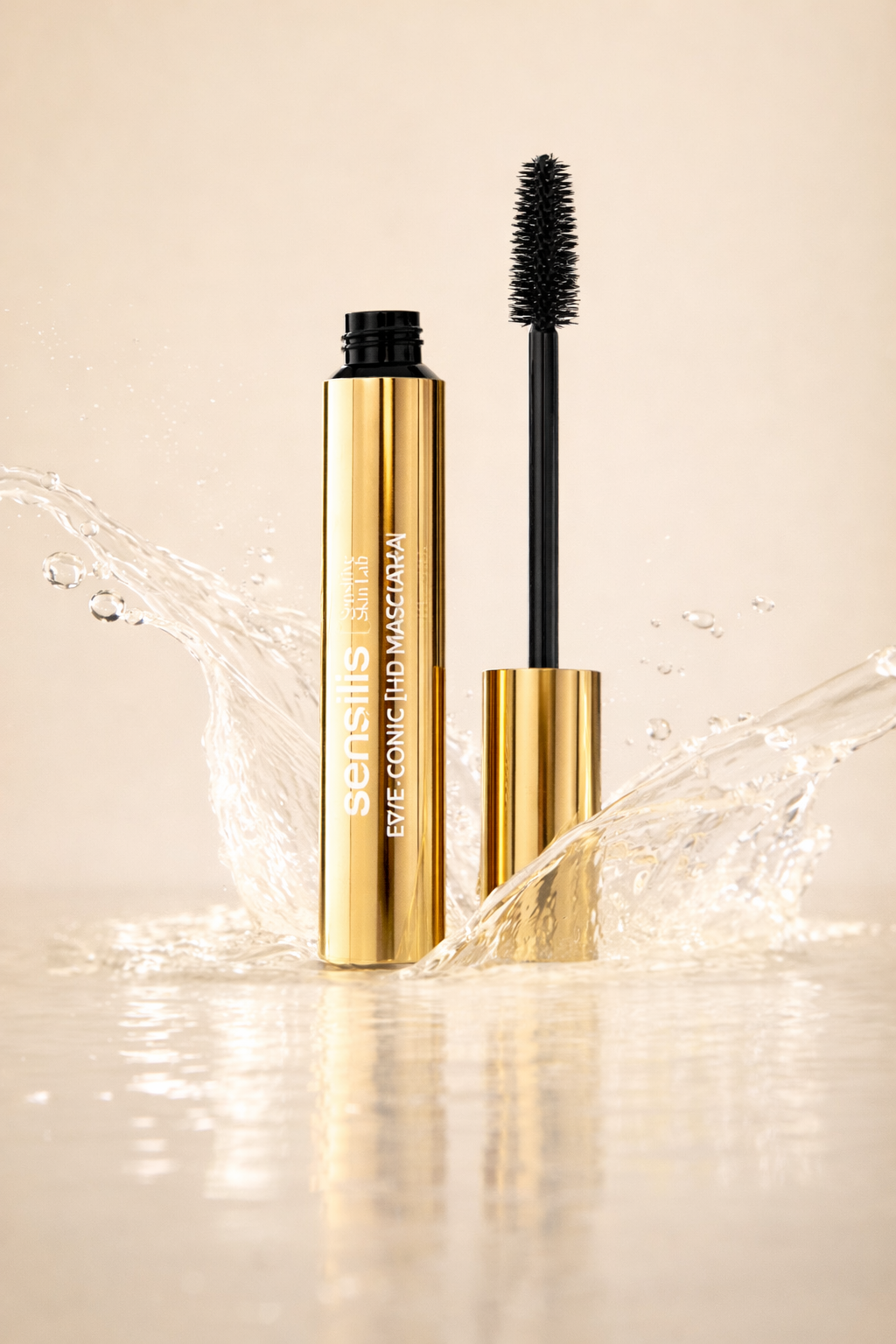 Integrarea vizuală cu ochiul real (genele din imagine) susține promisiunea produsului: volum, curbare și impact imediat.