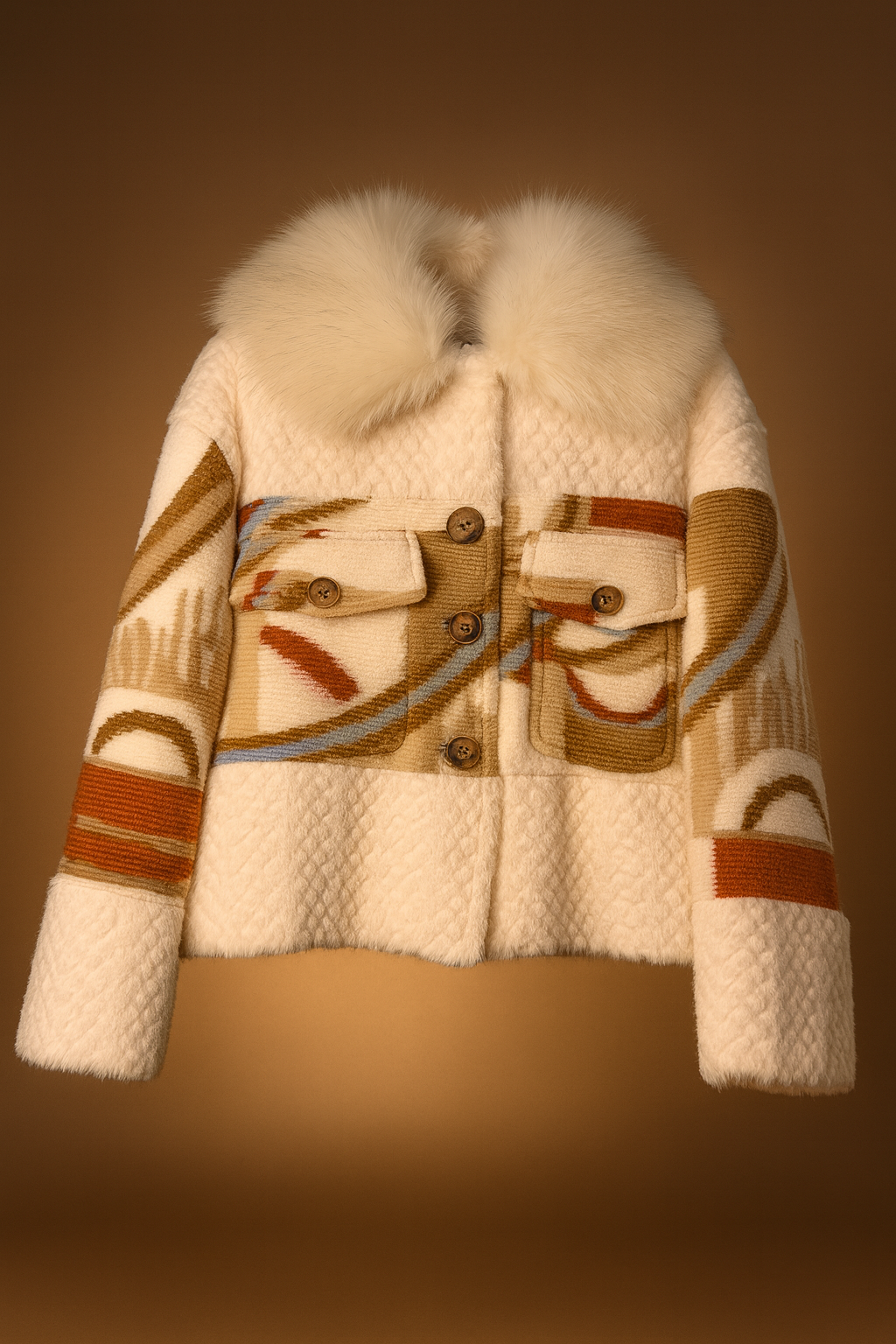 💫 Palton scurt din lână naturală cu inserții de mohair și guler din blană ecologică ivory.