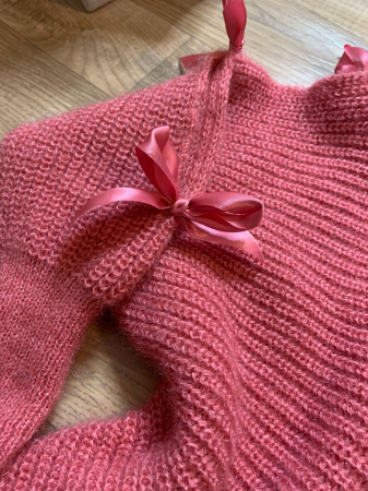 Pe mâneci are fundițe delicate, realizate din satin din aceeasi culoare. Fundițele cusute cu grijă, pentru a adăuga o notă feminină și jucăușă puloverului.
