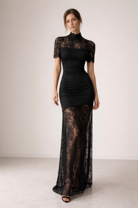 Partea superioară cu guler înalt și dantelă fină adaugă un aer elegant, în timp ce croiala tip corset evidențiază talia. Fusta lungă, realizată din dantelă transparentă, creează un efect vizual senzual și alungește linia corpului.