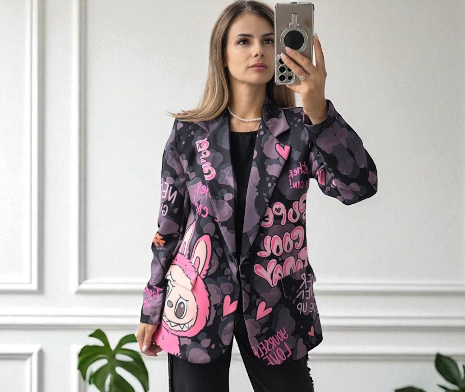 Transformă-ți outfitul într-o declarație de stil cu sacoul Puckie Boo ✨. Realizat din materiale premium, cu o textură plăcută și finisaje de înaltă calitate, acest sacou îmbină vibe-ul urban cu accente playful și glam. Personajele grafice și imprimeurile cool îl fac o piesă unică, perfectă pentru femeia modernă care vrea să iasă din tipare.