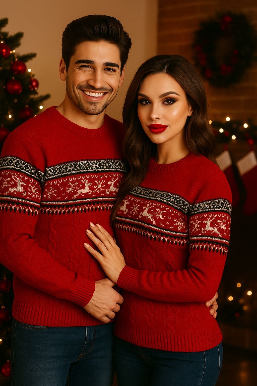 Setul 1+1 Pulovere Parfumate de Cuplu este construit pentru impact emoțional și vizual în sezonul de sărbători. Piesele vin tratate cu o aromă discretă, plăcută, care amplifică experiența de purtare și diferențiază clar produsul pe raft. Designul se bazează pe tricot roșu intens, completat de motive nordice tradiționale – reni, fulgi și linii geometrice – poziționate pe bust pentru un efect festiv premium.