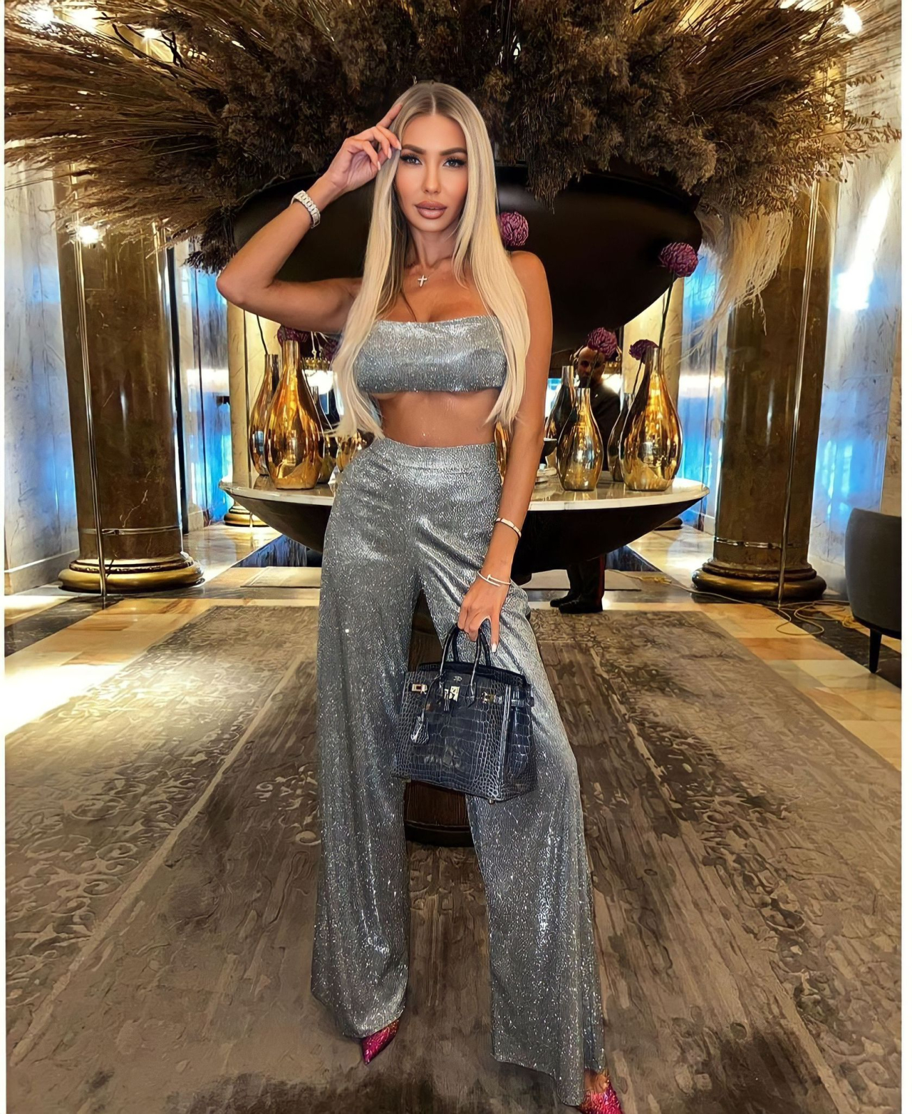 Setul Evening Glam Luxury este alegerea perfectă pentru femeile care adoră eleganța contemporană și strălucirea sofisticată. Construit dintr-un material fin, plin de micro-paiete argintii, setul este compus dintr-un top bandeau cu croială minimalistă și pantaloni tip palazzo cu talie înaltă, care alungesc optic silueta.