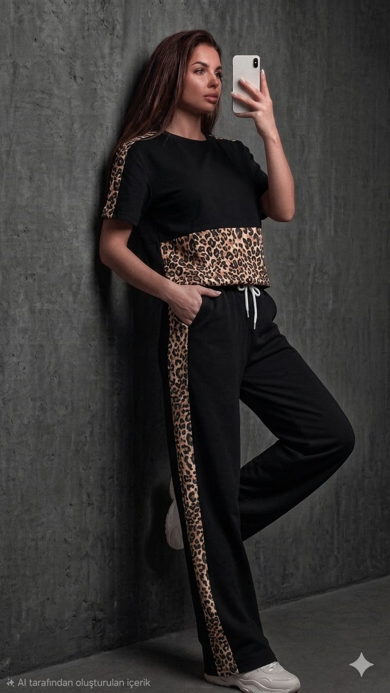 Tricoul are un design actual, cu bandă leopard frontală și pe mâneci, iar pantalonii completează perfect setul prin linia curată și detaliul lateral care alungește vizual silueta.