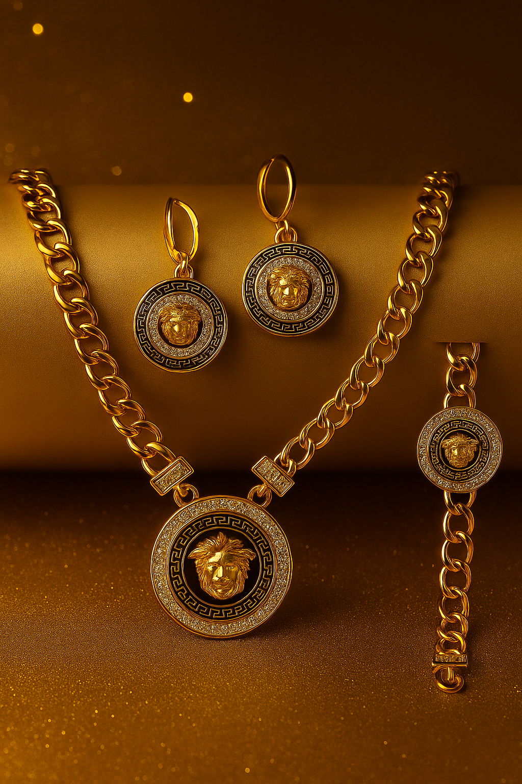 Setul „Royal Medusa Gold” este expresia supremă a eleganței regale și a rafinamentului atemporal. Cu un design impunător și detalii sculptate meticulos, acest set redefinește luxul contemporan. Medalioanele cu emblemă Medusa simbolizează forța și încrederea, în timp ce lanțurile groase aurii emană putere și stil.