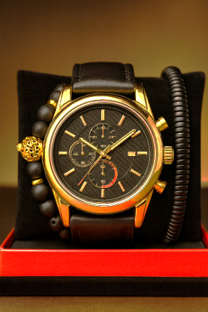 ⏱️ Ceasul, piesa centrală a setului, este construit din oțel inoxidabil placat cu aur de 18K, cu un cadran negru texturat, marcaje aurii și subcadrane funcționale care adaugă profunzime vizuală. Cureaua din piele naturală neagră, moale și rezistentă, oferă confort maxim și un look impecabil. Mecanismul Quartz japonez garantează precizie și durabilitate, simbolizând controlul și eficiența celui care îl poartă.