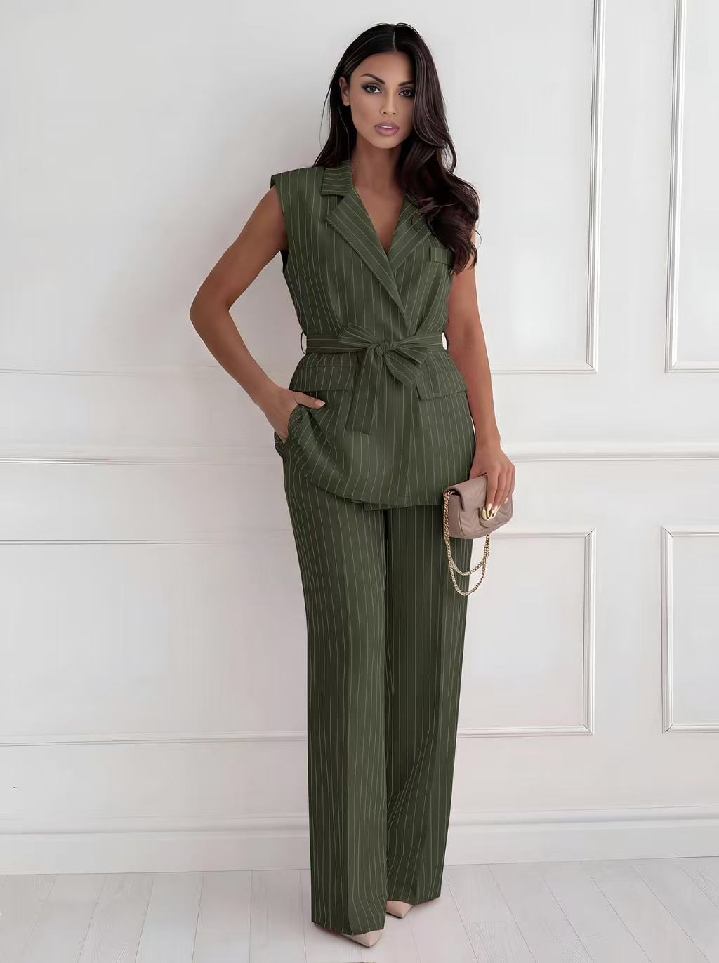 Un set statement, construit pentru o prezență puternică și rafinată. Vesta tip sacou, fără mâneci, cu rever clasic și cordon în talie, conturează silueta și oferă un aer sofisticat, modern. Pantalonii cu croială largă alungesc vizual linia corpului și adaugă fluiditate ținutei. Dungile verticale subțiri creează efect de subțiere și eleganță business. Ideal pentru apariții office premium, evenimente sau styling smart-casual cu impact.