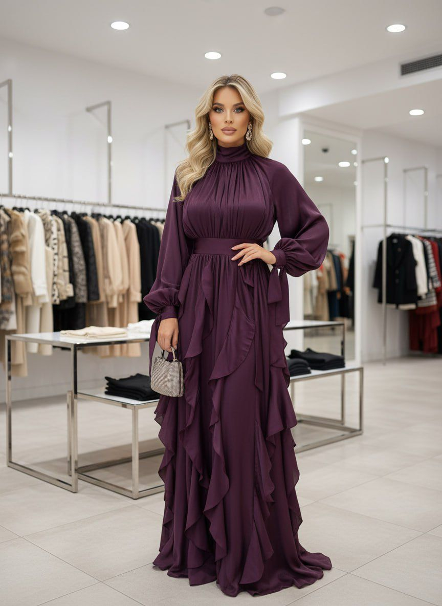 Rochia „Royal Amethyst” emană eleganță clasică și rafinament modern. Cu o croială fluidă și detalii minuțios lucrate, această piesă redefinește feminitatea sofisticată. Gulerul înalt și pliurile fine din zona bustului accentuează eleganța naturală, în timp ce talia marcată subliniază silueta într-un mod delicat. Volanele ample conferă mișcare și grație, transformând fiecare pas într-un statement de stil. Perfectă pentru evenimente de seară, gale, recepții sau ocazii speciale.