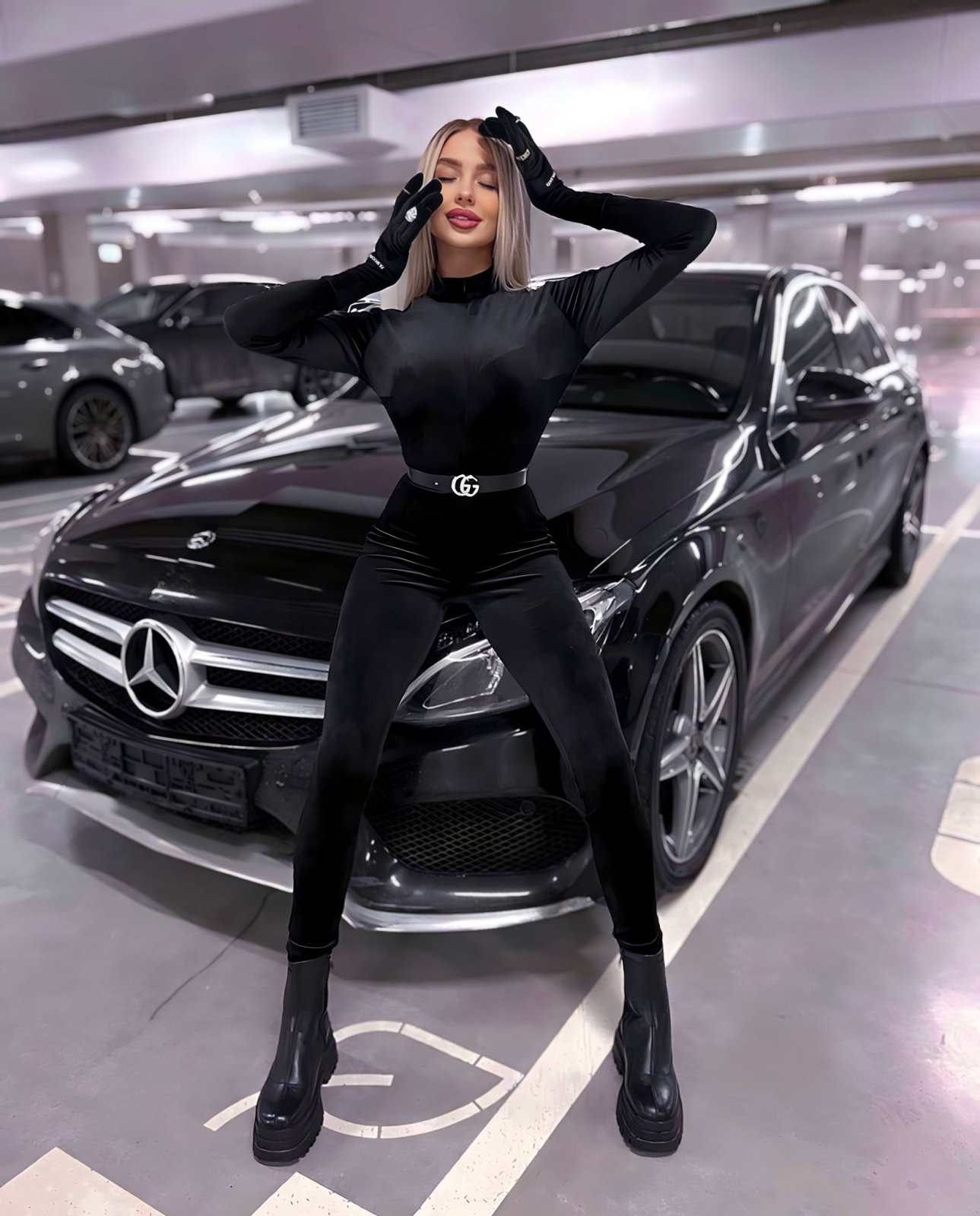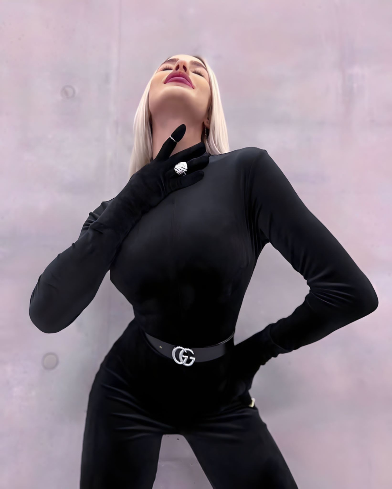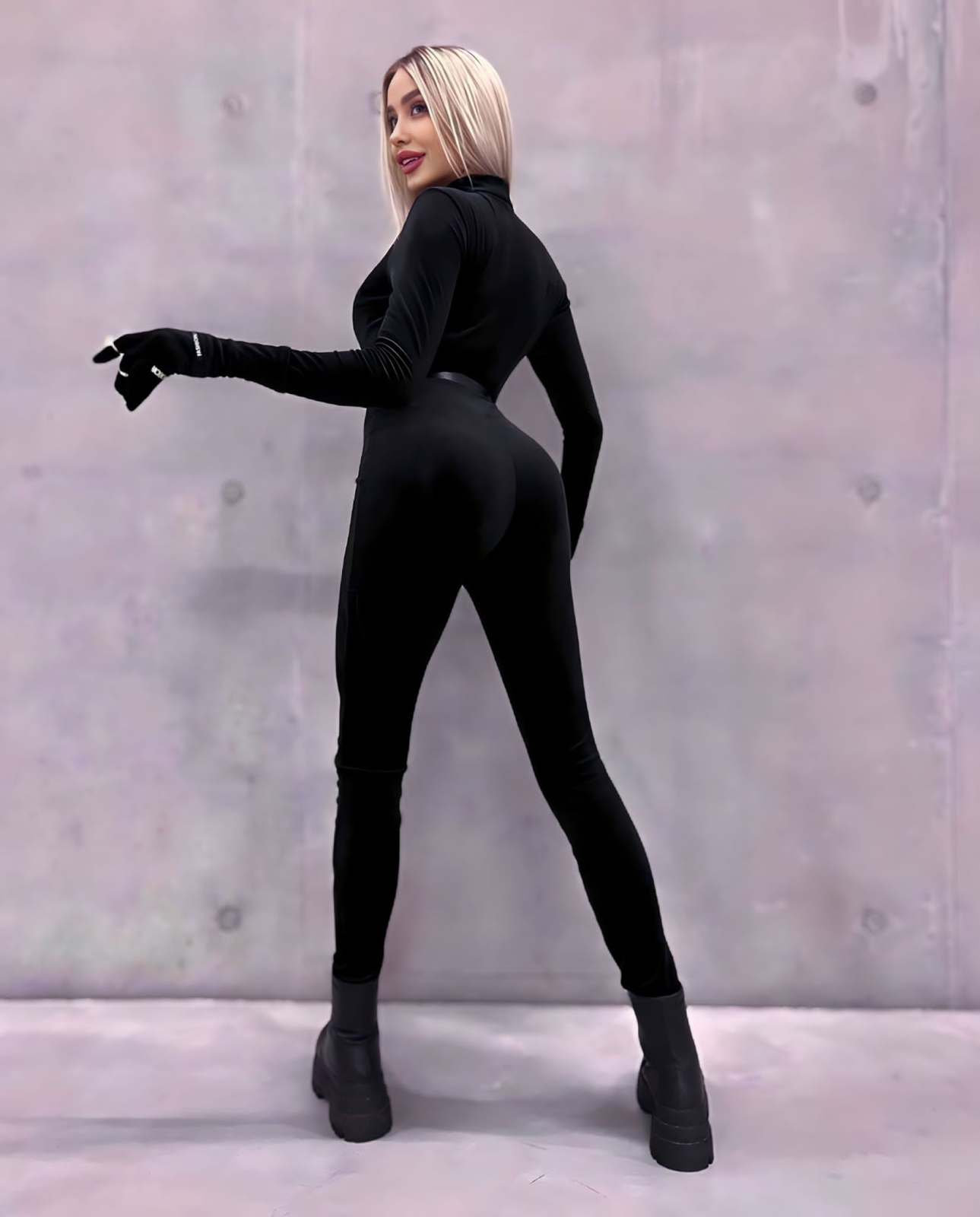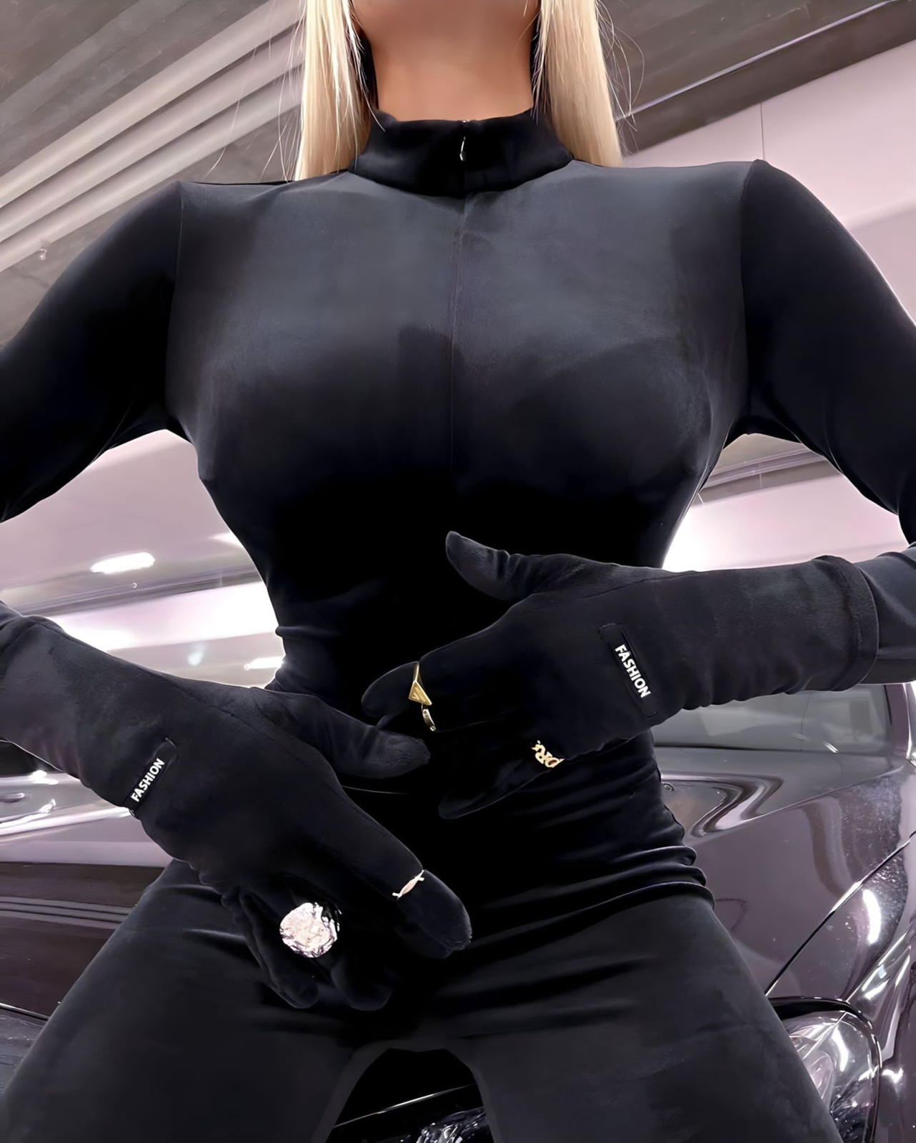 Salopetă integrală din catifea fină, cu mănuși incluse, creată pentru un look sofisticat și dramatic. Materialul moale și ușor elastic oferă o senzație luxuriantă pe piele, în timp ce croiala mulată evidențiază perfect silueta. Designul minimalist, complet negru, transmite eleganță pură și atitudine, fiind alegerea ideală pentru apariții de seară, evenimente glam sau editoriale high-fashion.