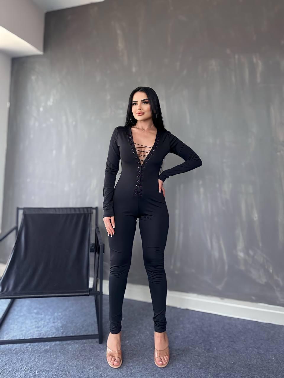 Salopetă neagră cu croi mulat, gândită să evidențieze silueta și să ofere o apariție elegantă, dar plină de atitudine. Detaliul frontal cu șireturi încrucișate adaugă o notă senzuală și modernă, în timp ce materialul elastic asigură confort și libertate de mișcare. Se potrivește perfect pentru o seară în oraș, un eveniment fashion sau o apariție statement.
