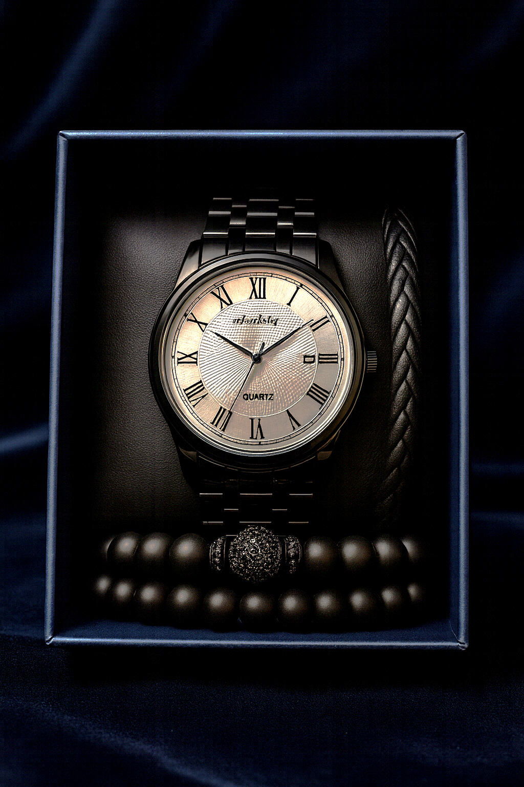Un set creat pentru bărbatul care nu are nevoie de lumini pentru a străluci. Midnight Monarch Set combină rafinamentul metalic cu misterul negrului mat, oferind un look impunător, sobru și irezistibil.