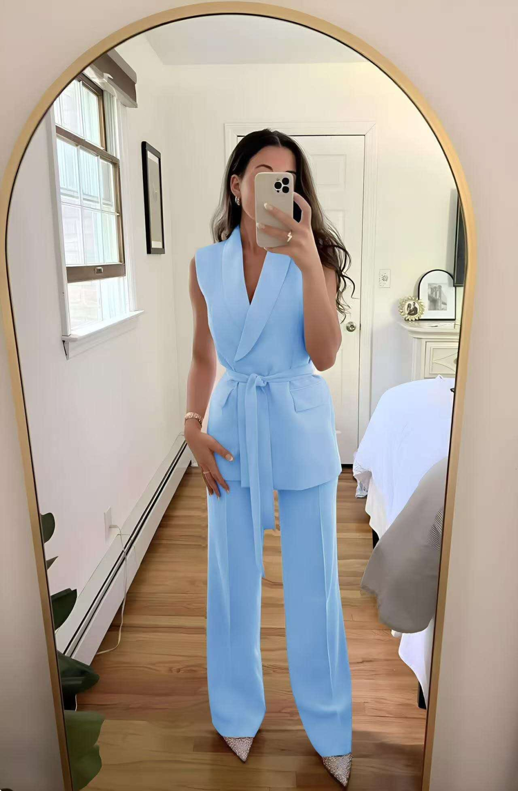 Pantalonii cu talie înaltă și croială largă alungesc optic silueta, iar ansamblul transmite putere, rafinament și feminitate contemporană. Este alegerea ideală pentru întâlniri business, evenimente elegante sau apariții smart-casual premium.