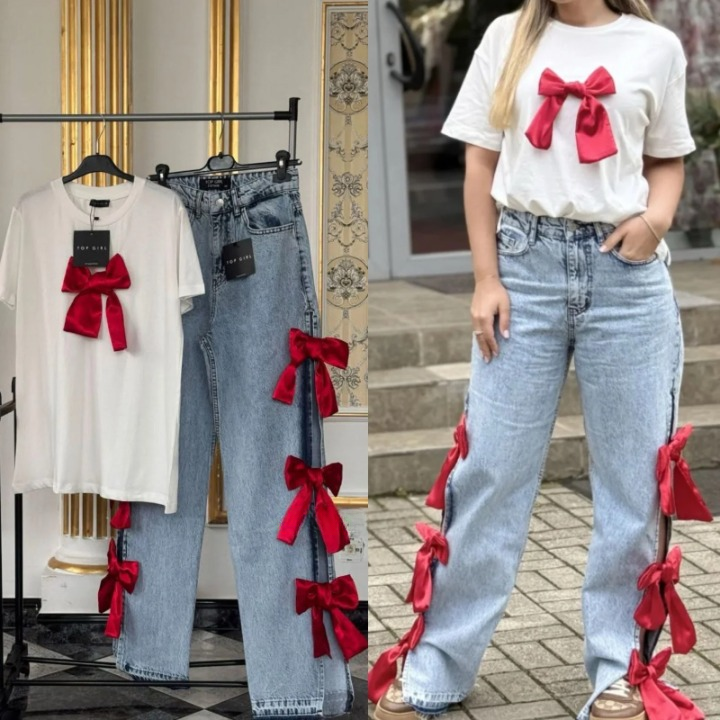 Acest compleu adorabil numit Rosette este definiția feminității jucăușe și a stilului romantic! Format dintr-un tricou alb basic, pus în valoare de o fundiță statement roșie din satin și o pereche de jeanși largi cu croi modern, decorați cu fundițe elegante de-a lungul picioarelor, acest set reușește să îmbine perfect confortul cu un aer chic și original. Fiecare detaliu este gândit pentru a atrage privirile și a adăuga un strop de farmec ținutelor tale casual. Rosette este alegerea ideală pentru zilele în care vrei să ieși din tipare și să-ți exprimi personalitatea prin ținuta ta. Combină-l cu adidași, balerini sau chiar tocuri și vei avea un look fresh, creativ și super cute! 🌹✨
