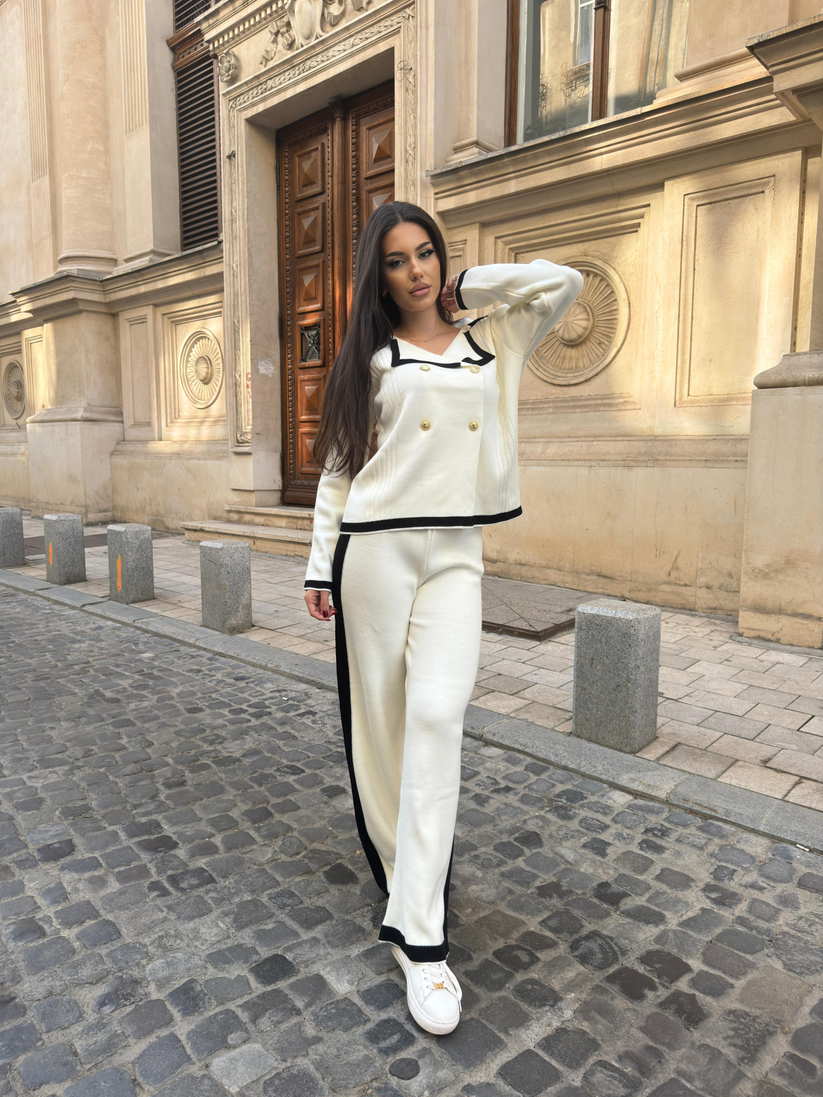 📸 Compleul vine în două variante cromatice – alb cu detalii negre și negru cu detalii albe – ambele la fel de rafinate și de ușor de purtat.
