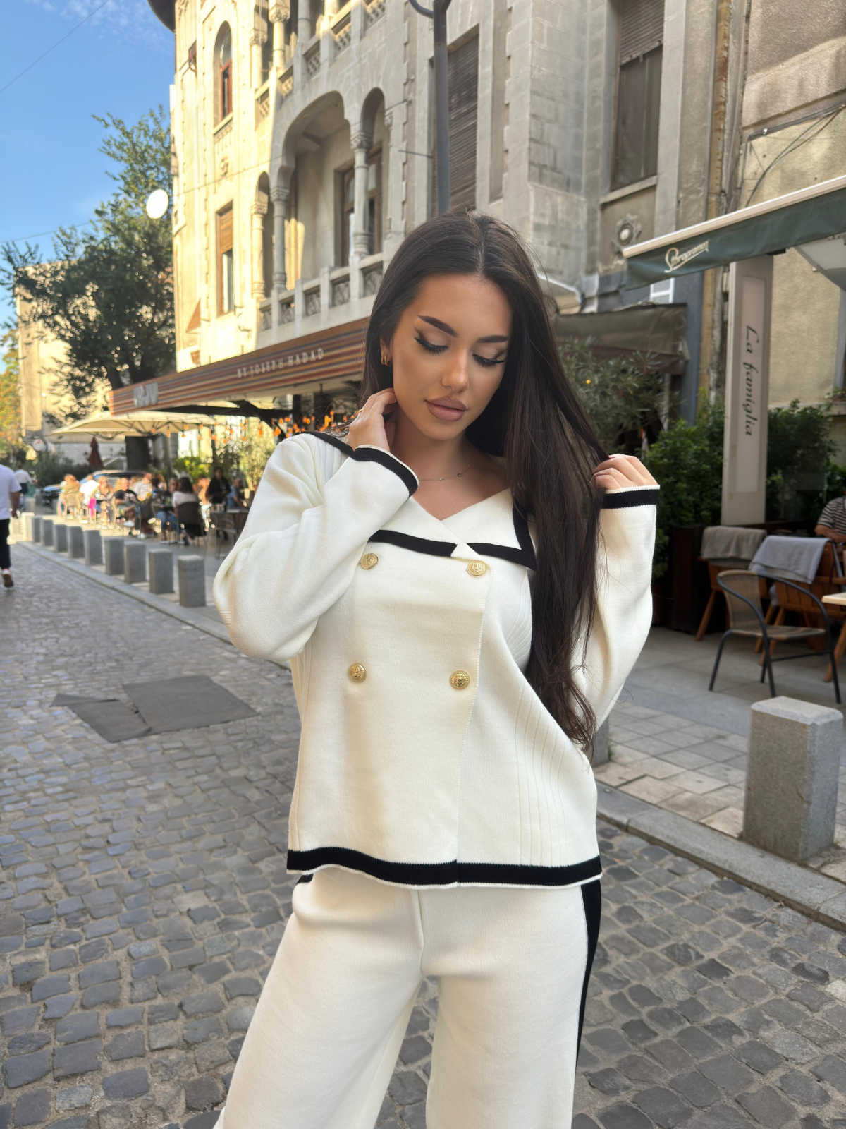 • Detalii contrastante în alb-negru, puse în valoare de nasturii aurii premium ✨, care adaugă un accent de lux.