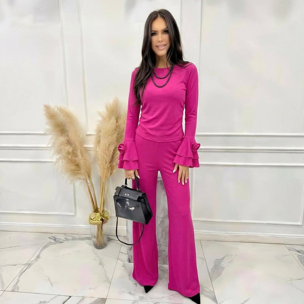 Compleu feminin cu design minimalist și impact vizual puternic, format din bluză cu mâneci lungi terminate cu volane decorative și pantaloni cu croială dreaptă, fluidă. Bluza evidențiază silueta prin linie cambrată și guler rotund clasic, oferind un look rafinat și modern.