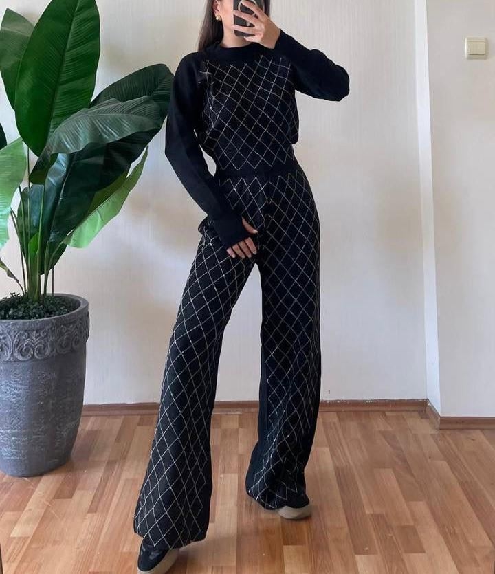 Materialul moale și ușor elastic oferă o senzație plăcută pe piele, iar imprimeul discret în carouri adaugă un plus de rafinament. Bluza are o croială modernă, cu manșete lungi și degete decupate, în timp ce pantalonii au talie înaltă și o linie elegantă, ușor evazată.