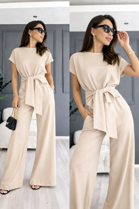 Topul lejer, cu linie minimalistă, este completat de cordonul amplu din talie, care definește subtil formele și creează un efect vizual de siluetă alungită. Pantalonii largi, cu cădere fluidă, adaugă un aer sofisticat și oferă libertate totală de mișcare.
