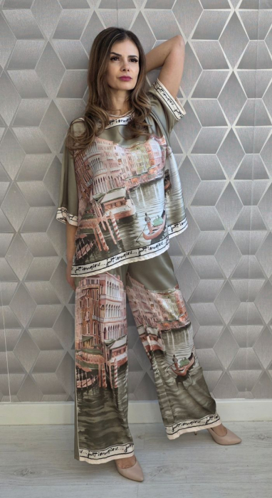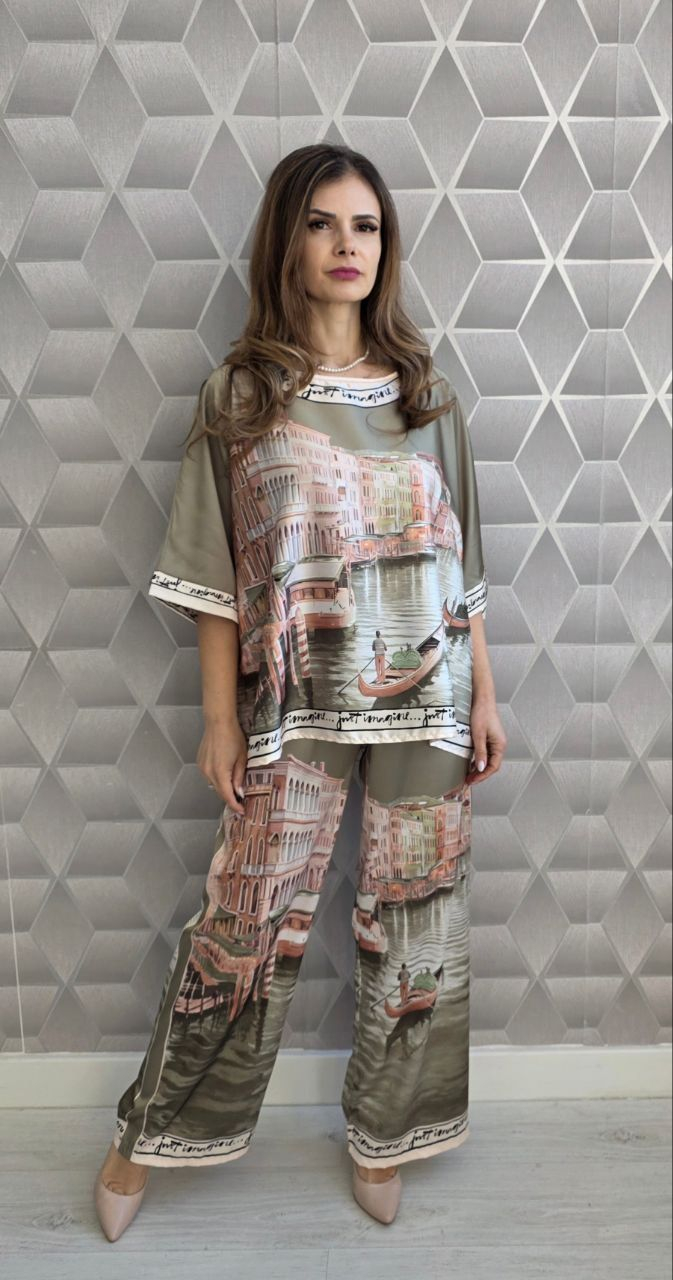 Compleu elegant din două piese, cu imprimeu artistic inspirat de peisajele romantice din Veneția. Designul oversized al bluzei oferă confort și rafinament, în timp ce pantalonii cu croială lejeră completează perfect look-ul sofisticat, dar relaxat.