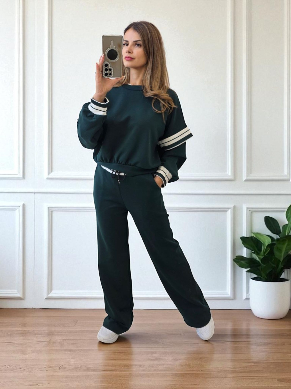 Bluza are croi relaxat, cu mânecă lungă și detalii în dungi contrastante pe mâneci și guler, ce oferă un vibe modern, sport-chic. Pantalonii sunt cu talie elastică și șnur reglabil, croi drept și buzunare laterale, ceea ce îi face funcționali și practici.