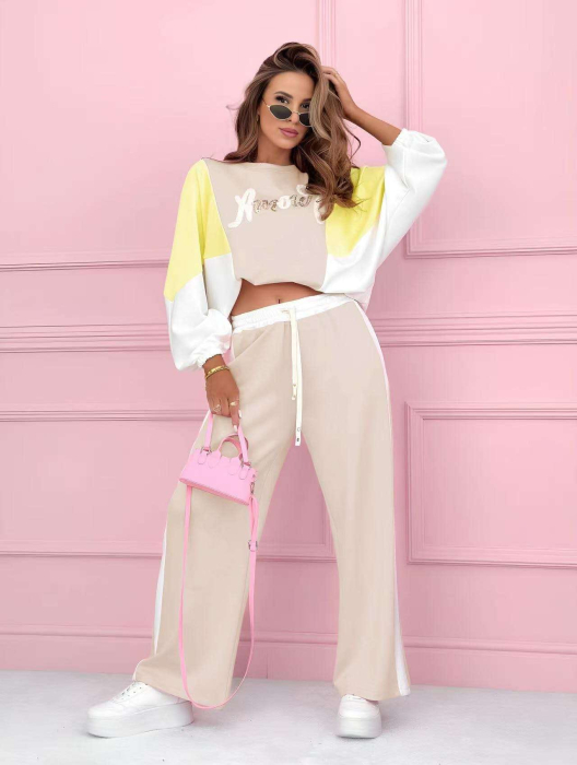 Compleu casual-chic în combinație fresh de galben pastel, roz și alb, creat pentru apariții îndrăznețe și feminine. Bluza cropped cu mâneci ample și design color-block oferă un vibe modern, relaxat, iar pantalonii cu talie elastică și croială lejeră asigură confort maxim și libertate de mișcare.
