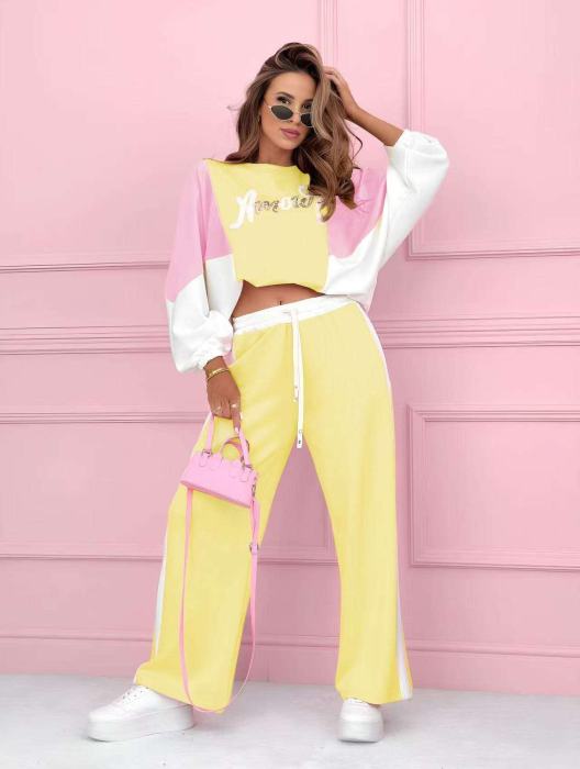 Compleu casual-chic în combinație fresh de galben pastel, roz și alb, creat pentru apariții îndrăznețe și feminine. Bluza cropped cu mâneci ample și design color-block oferă un vibe modern, relaxat, iar pantalonii cu talie elastică și croială lejeră asigură confort maxim și libertate de mișcare.