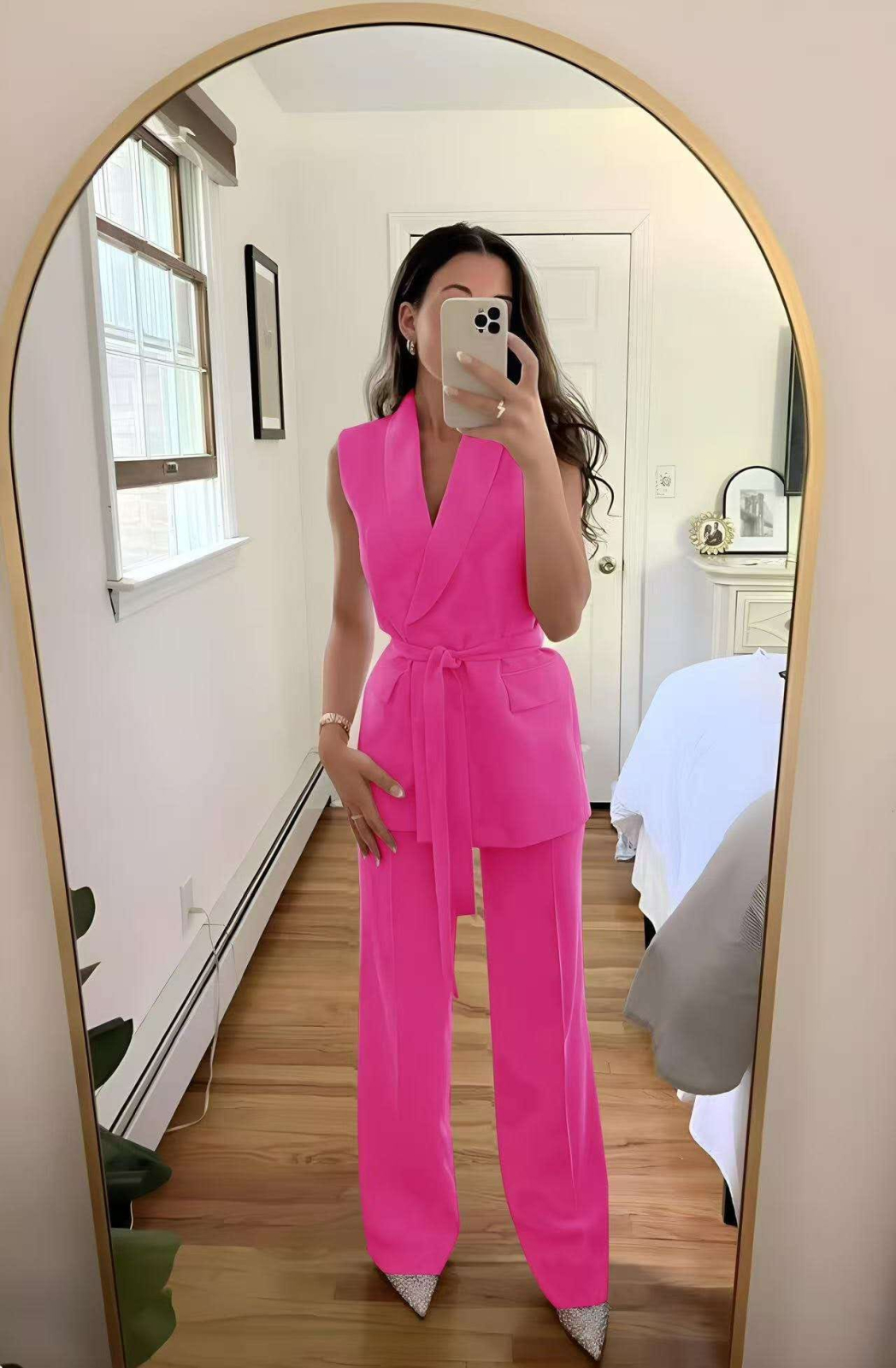 Pantalonii cu talie înaltă și croială largă alungesc optic silueta, iar ansamblul transmite putere, rafinament și feminitate contemporană. Este alegerea ideală pentru întâlniri business, evenimente elegante sau apariții smart-casual premium.