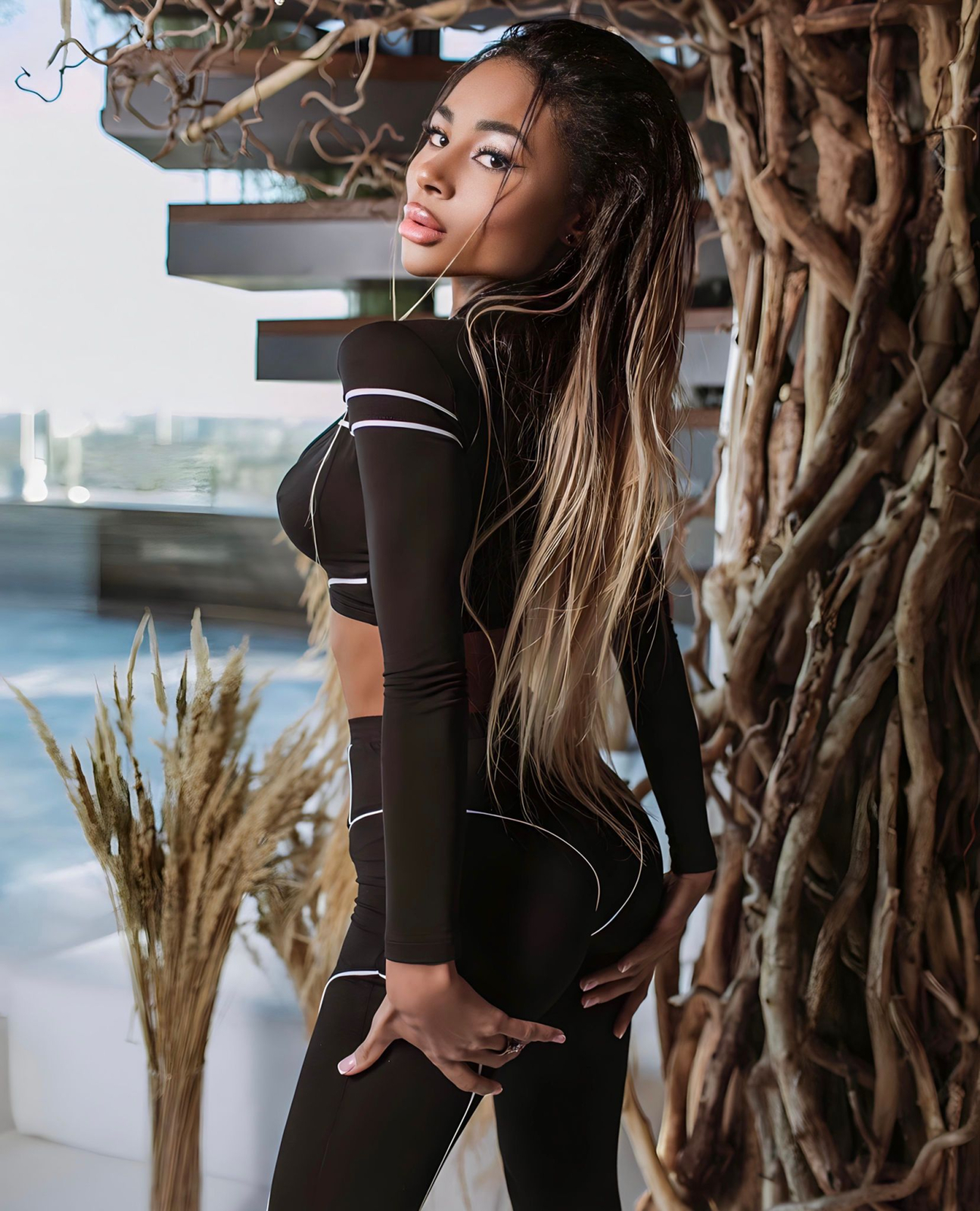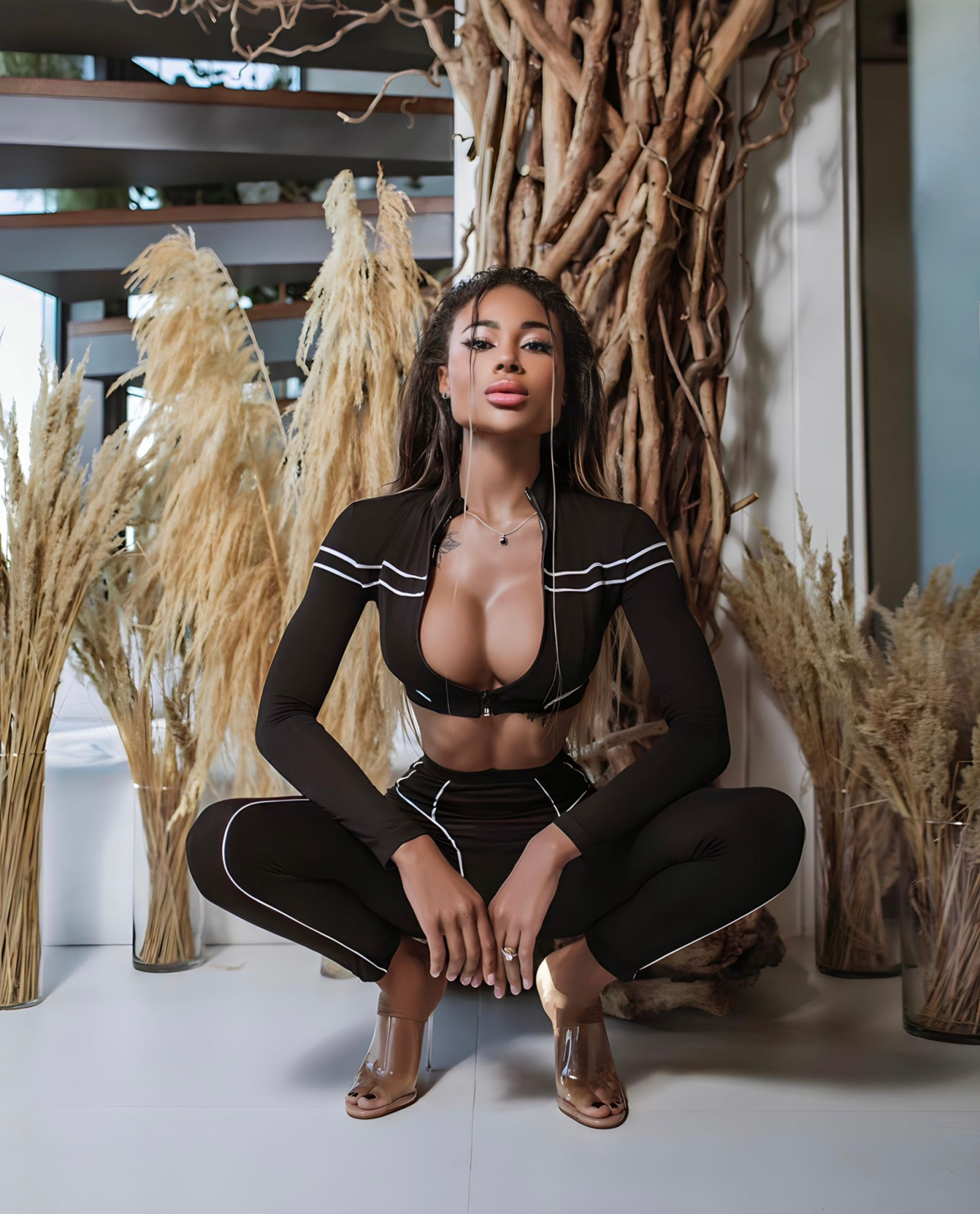 Set format din top scurt cu mânecă lungă și pantaloni mulați, realizat din material tehnic elastic cu inserții contrastante albe ce evidențiază liniile corpului. Designul este inspirat din stilul sport-lux, combinând funcționalitatea activwear-ului cu estetica urban-chic.