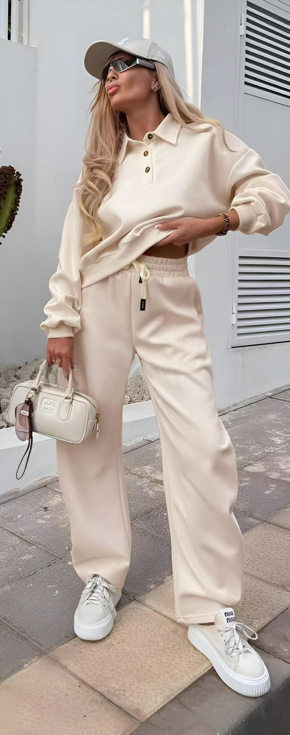 Set casual premium format din bluză tip polo cu croi lejer și pantaloni cu talie elastică și șnur reglabil. Design minimalist, orientat spre funcționalitate și stil urban contemporan. Bluza oferă structură prin guler și nasturi decorativi, iar pantalonii au croială dreaptă, asigurând confort ridicat și libertate de mișcare.