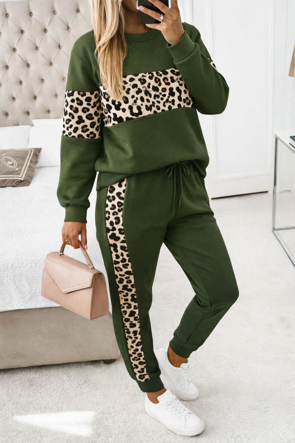 Set sport-casual format din bluză și pantaloni, cu design modern evidențiat prin inserțiile animal print care adaugă personalitate și impact vizual. Bluza are croială lejeră și mâneci lungi, iar pantalonii sunt prevăzuți cu talie elastică și șnur reglabil pentru un plus de confort.